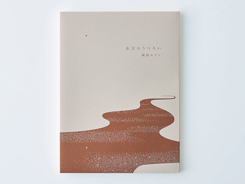 私が装幀をした『水天のうつろい』は、著者の岡田ユアンが自身の子供をうみ出す前後の時間を綴った詩集である。「水天」は仏教における水の神様で、日本では安産・子授けの神様として知られている。詩集の表紙は、永遠の時を持つ宇宙に一筋の水が流れ新たな時間が始まることを示唆している。ファインペーパー い織りの静かな和のテクスチャーが、ブロンズインクで刷られた水面に浮かび上がり、スモークホワイトの偏りのないニュートラルな色調が空間を際立たせる。新しくうみ出された言葉たちを、フランス装に想を得た繊細な造本で包んだ。(長澤昌彦さん)