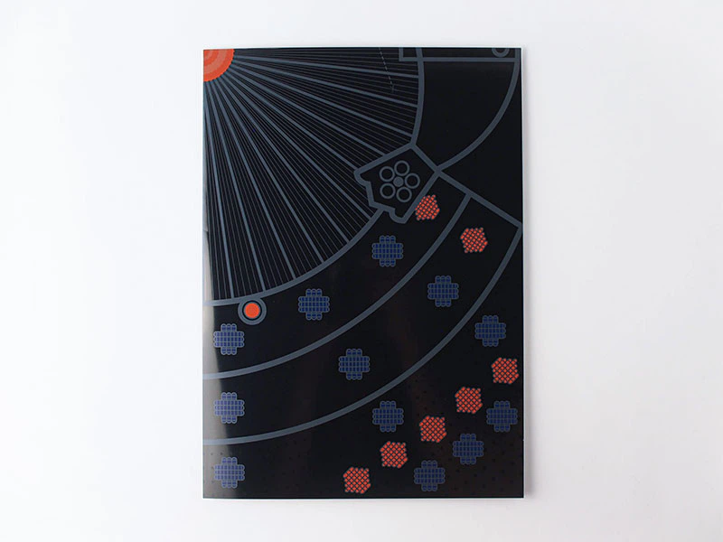 「LK カラーN-FS」の持つマットな印象の光沢が兜の漆の質感に似ていることと、紙の丈夫さからこの紙を選択しました。ペーパー「LK カラーN-FS」黒の色を生かす為、白インキで色部分を印刷しその上から色の版をのせて特色4色で印刷しました。