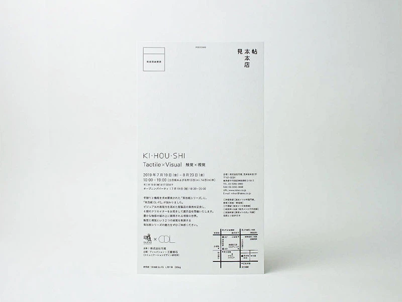 見本帖本店2Fで開催している「KI・HOU・SHI Tactile×Visual 触覚×視覚」展のDMをご紹介いたします。