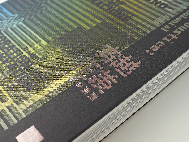 我一直很喜歡蒝織紙密度很高、細看很錯綜複雜的紋理,而且印刷深色的效果也很好。因為這一本書的主題與科技感有關,但是要描述的並非是科技的美好前衛,反而要傳達的是展覽中,由科技主題延伸出的七大理念,並且讓七大理念隱晦地貫穿在封面繁複的雜訊之中,因此我選擇用有交錯網狀紋理的蒝織紙,「紙的紋理」與「雜訊的紋理」,兩者交互在封面上,產生第三種肉眼很難對焦的複雜紋路。讀者拿起這本書時,不只是視覺上看到錯綜難辨的封面紋路,手上也可以感覺得到蒝織紙密度很高的交錯感。