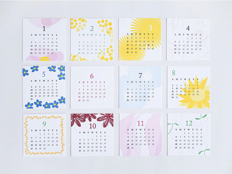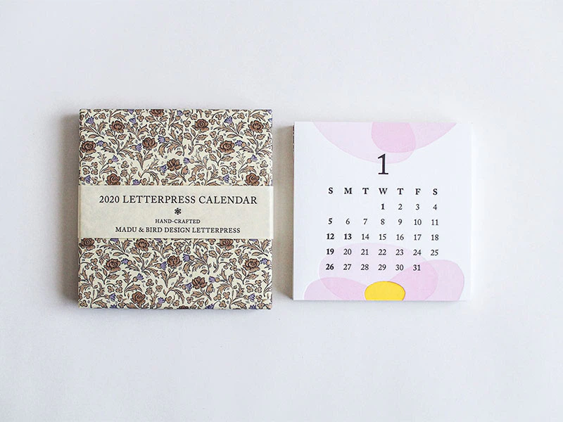 2020年版レタープレスカレンダーは「お花」がモチーフ。ひと月毎に変わるお花の季節感と、活版印刷ならではの同系色オーバープリントや、印圧調整によるへこみ具合の変化を取り入れた意欲的なカレンダーに仕上げています。