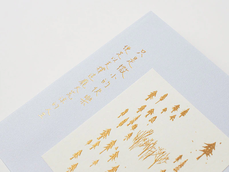 雪は太陽の下で柔らかくなり、雪に覆われて輪郭のぼやけた木々も、雪が解けて奇妙な形になります。「わたがみ」と金のバーコ印刷によってモミの木が陽光を受けて黄金に輝き、解けた雪がしっとりと木々を覆っているような感じになりました。(林小乙さん)