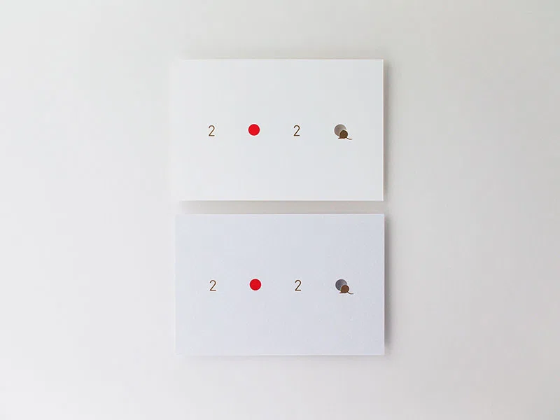日の丸の赤をイメージした赤箔とおめでたい印象を与える金箔を用いて、年号である「2020」をシンプルなタイポグラフィでデザインし、今年の干支である鼠が巣穴に戻る様子を抜き加工で表現しています。(株式会社竹尾 企画部)