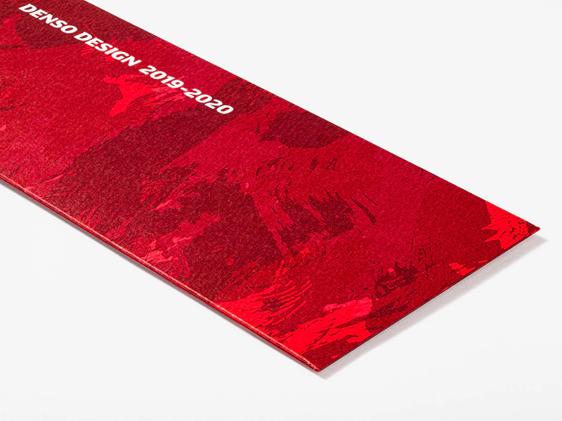 スリーブは赤のマーメイドと赤系の三つの特色インキを重ねて、モノづくりの熱量や深みを表現し、さらに開口部の波打った裁ち落としで、情熱がにじみ出るさまを表しました。対照的に、中のカードは透明箔と気包紙の組み合わせでシンプルに仕立てています。(株式会社デンソー デザイン部 秋山さん)