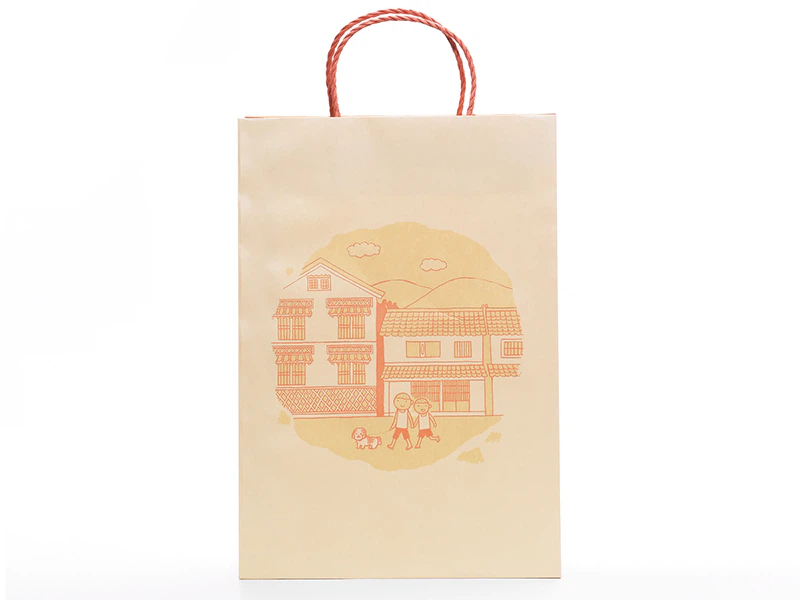 愛しい我が子に食べさせたい、大好きな人を笑顔にしたい、そんな想いでお煎餅・芋けんぴ・豆菓子の製造を続ける「我が子菓子 善蔵」。直営店舗のある愛媛県喜多郡内子町を訪れた時に見た美しい白壁の町並みから、手提げ袋はクラフトペーパー ハーフにホワイトを印刷しようと考えた。紙色が背景でなく色として見えるように配色した。(長澤昌彦さん)