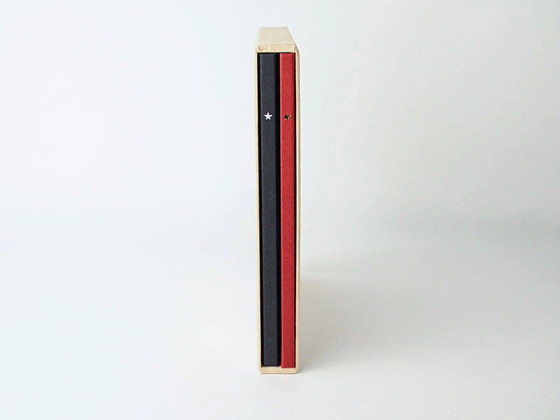 髙仲さんの漫画と作品集のお話をいただいた時、その2冊をお揃いの紙で装丁できたらいいなと思いました。元々表紙用に紙で切ったパーツを貼った作品があり、そのイメージを元に、表紙の紙の候補を「黒と赤」に絞りました。髙仲さんの自然いっぱいの暮らしとつなげて、他の候補と検討ののち「ビオトープGA-FS」を選びました。
