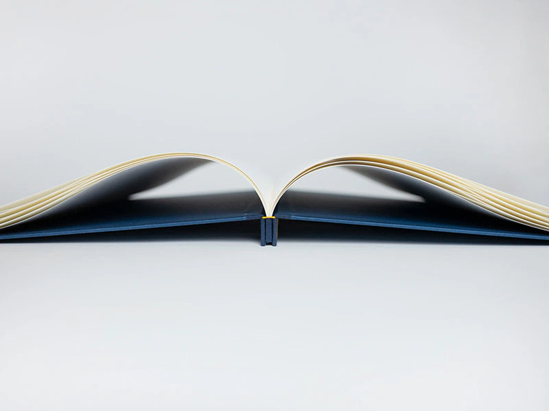 能舞台の上で、手に持って朗読されることを念頭に置いて、台本の開きやすさ、ページのめくりやすさ、めくった後の状態のキープのしやすさを、紙の質感と製本の構造で追求しました。