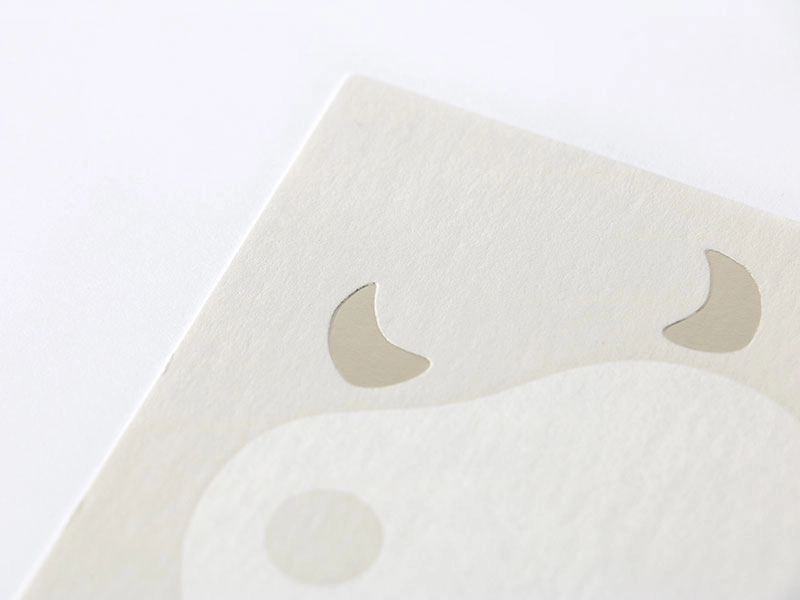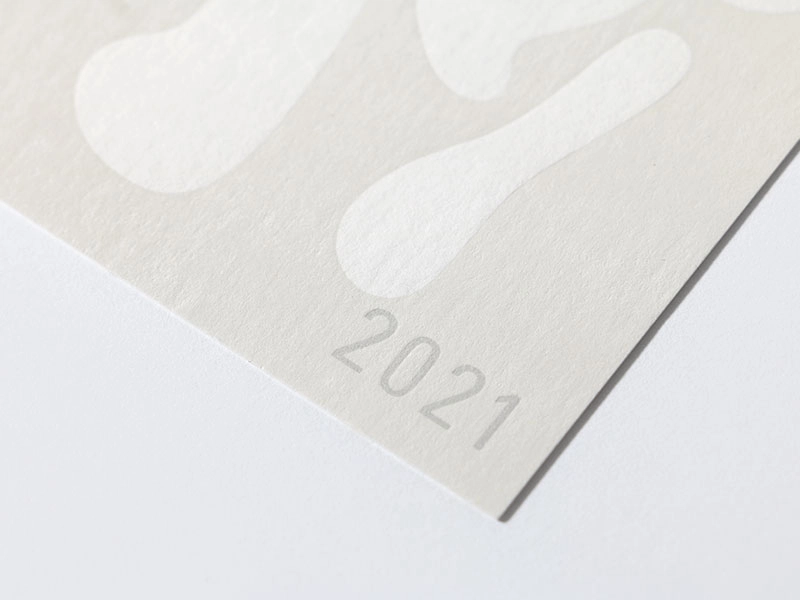2021年の年賀状は、「マーメイド」「気包紙 U-FS」の2種類で制作しました。今にもスタートを切って動き出しそうな躍動感のある、力強い牛の姿が描かれています。角部分はマットシルバーの箔押し、年号と背景は活版印刷、牛の体部分は紙地の白を活かしたデザインです。均一に美しく印刷されたベタ面と紙そのものの白地との質感の差異が際立って感じられる仕上がりになっています。