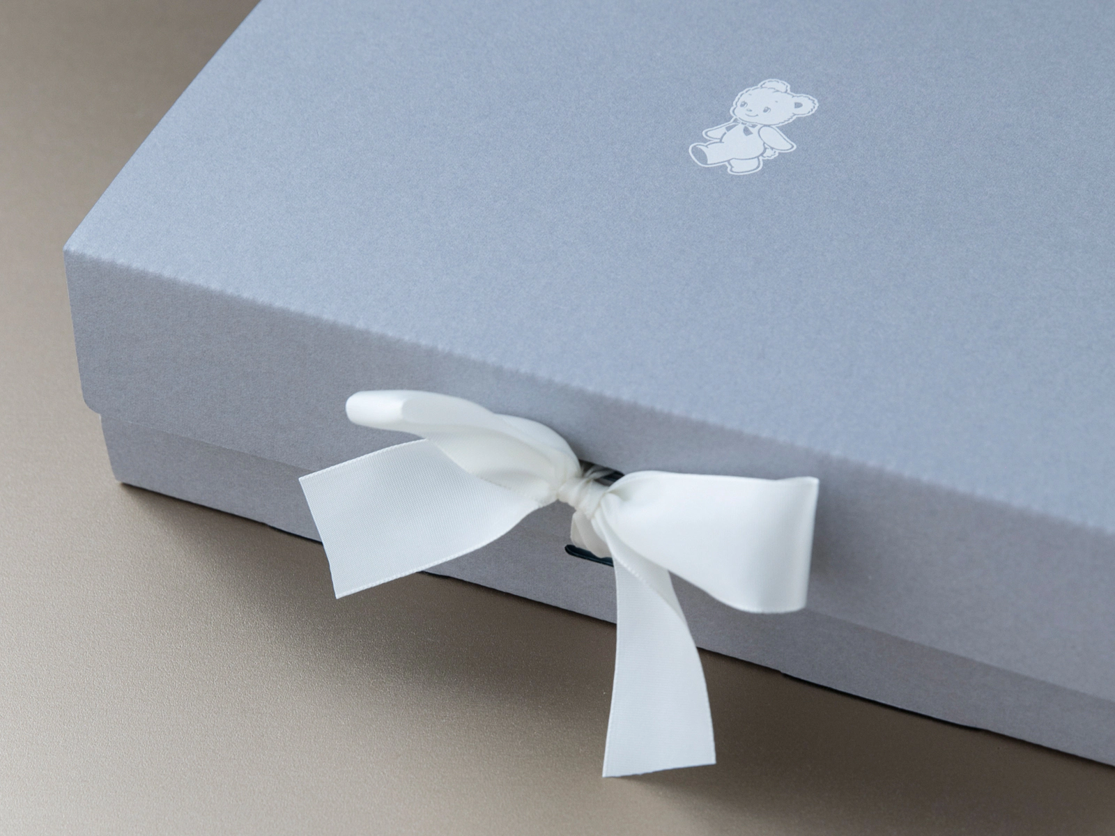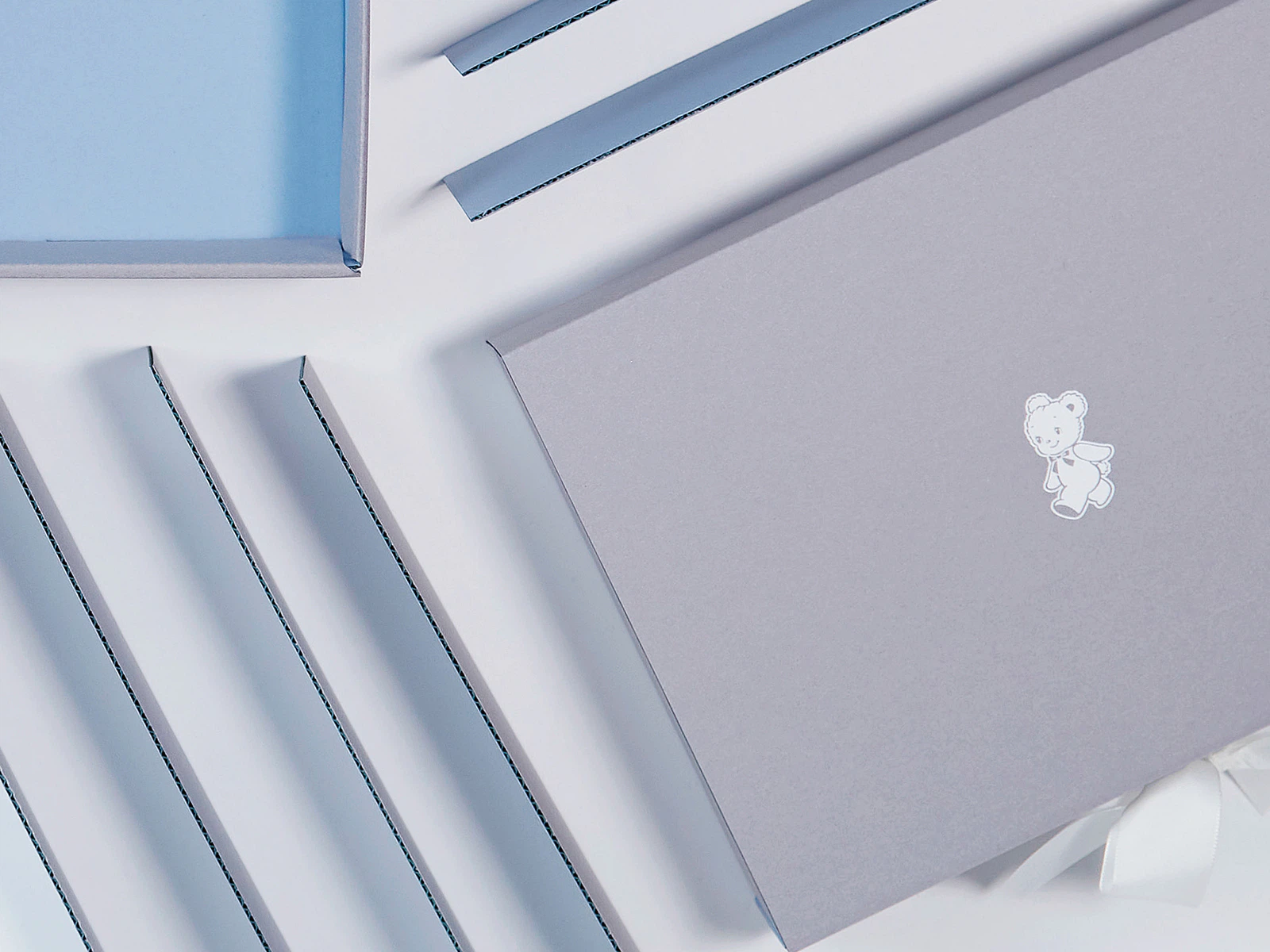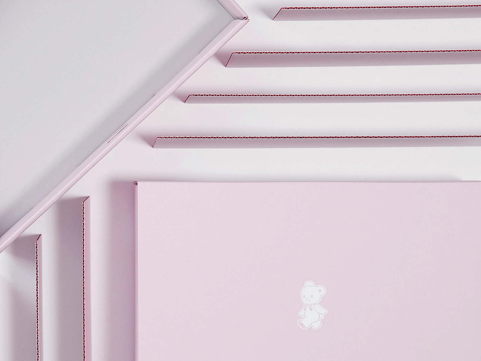 ブルー・ピンク・グレーのバリエーションを表現するために、豊かな色と美しさを合わせ持つ「ファインフルート」をセレクト。澄んだ空の色のブルーは、ファミリアのコーポレートカラーです。富士山の麓、静岡県の製紙工場で何度も色調整を行い、オリジナルの紙を創作。クマのアイコンは、シルクスクリーンで丁寧に仕上げました。パッケージとしての用途だけでなく、 収納箱や工作素材としてもサスティナブルにお使いいただけるように想いを込めたデザインです。(株式会社ファミリア)