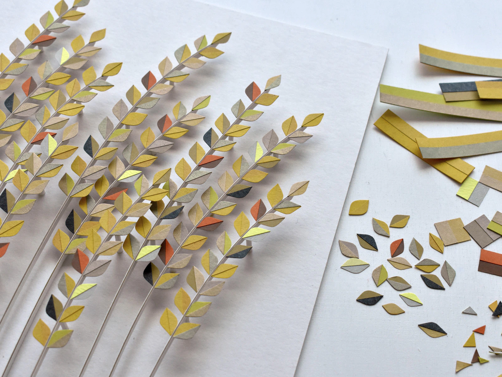モチーフの色や構造など思い描く表現方法を紙で試作しながら選びます。マーメイドは適度な強さがあり細工がしやすい上に、表面の反射が少なく、色がしっかりと見える感じがします。ビオトープGA-FSは深みのある色合いと質感が好きで選びます。ヴィンテージ ゴールドは今回初めて作品に使用。紙の独特の輝きと「ムギ」が黄金に輝く様を重ね合わせました。(長尾昌枝さん)