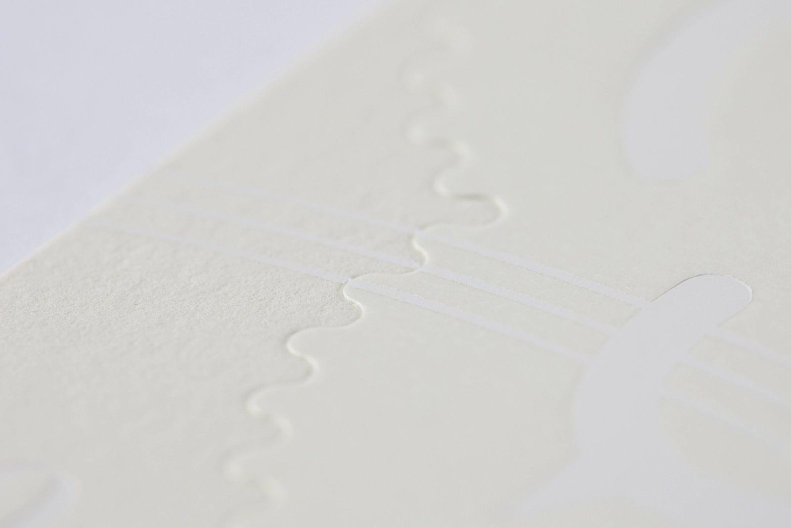 ソフトで温かな自然な素材感のファインペーパー「ロベール」に、優しいパール調の輝きを持つ「New特レーブル 輝き」を紙象嵌(かみぞうがん)加工で貼り合わせ、その上から白い箔押しを施しています。