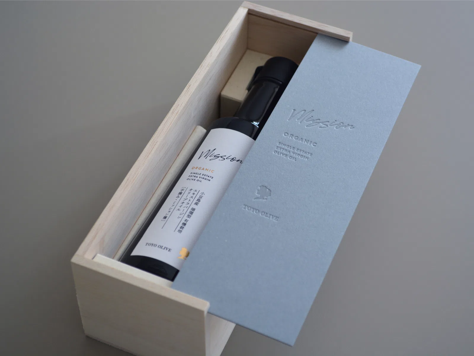 小豆島で循環型 有機栽培に取り組まれ、有機認証を受けた限られた区域の実から採る希少なオリーブオイル。このオイルの特別さや鮮度・美味しさのための背景を伺いながら打ち合わせを重ね「外装には木箱を」と方向性が決まりました。そこから仕様を具体的に固めていくなかで、大切な贈り物や自分へのご褒美として特別感のある佇まいだけでなく、循環型 有機栽培の土づくりにかかった年月や、小豆島という風土、海、風、季節や天気、そこでオリーブオイル作りに携わる方々の人柄なども込められないかと試したなかで、木製の身箱に「GAファイル ブルージーン」の蓋という素材違いの組み合わせがとてもしっくりくると感じ、ご提案しました。