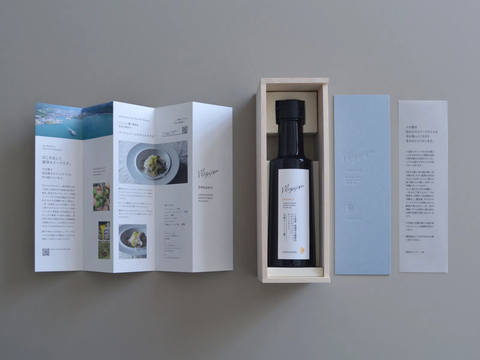 木箱を包むスリーブは、初見の印象を決める大切な素材なので、白さの質が高く、風合いが上品で存在感もあり、かつ強度・汚れにくさも兼ねそなえた「気包紙 C-FS ディープ ラフ」を。製品の案内栞にはオリーブやレシピの料理・海の色が綺麗に映えるまっすぐな白さと印刷の安定感、手触り・風合い・高級感もある「アラベール-FS スノーホワイト」。収穫期を迎えた東洋オリーブさんからの挨拶状は、手に取ったとき優しく芯のある「XDTトレーシング-FS クリアホワイト」を選びました。(シナモンさん)