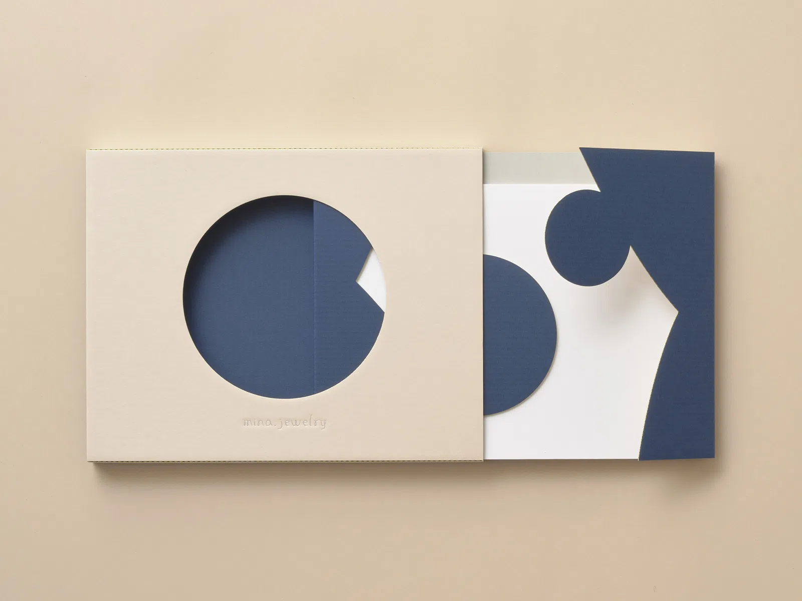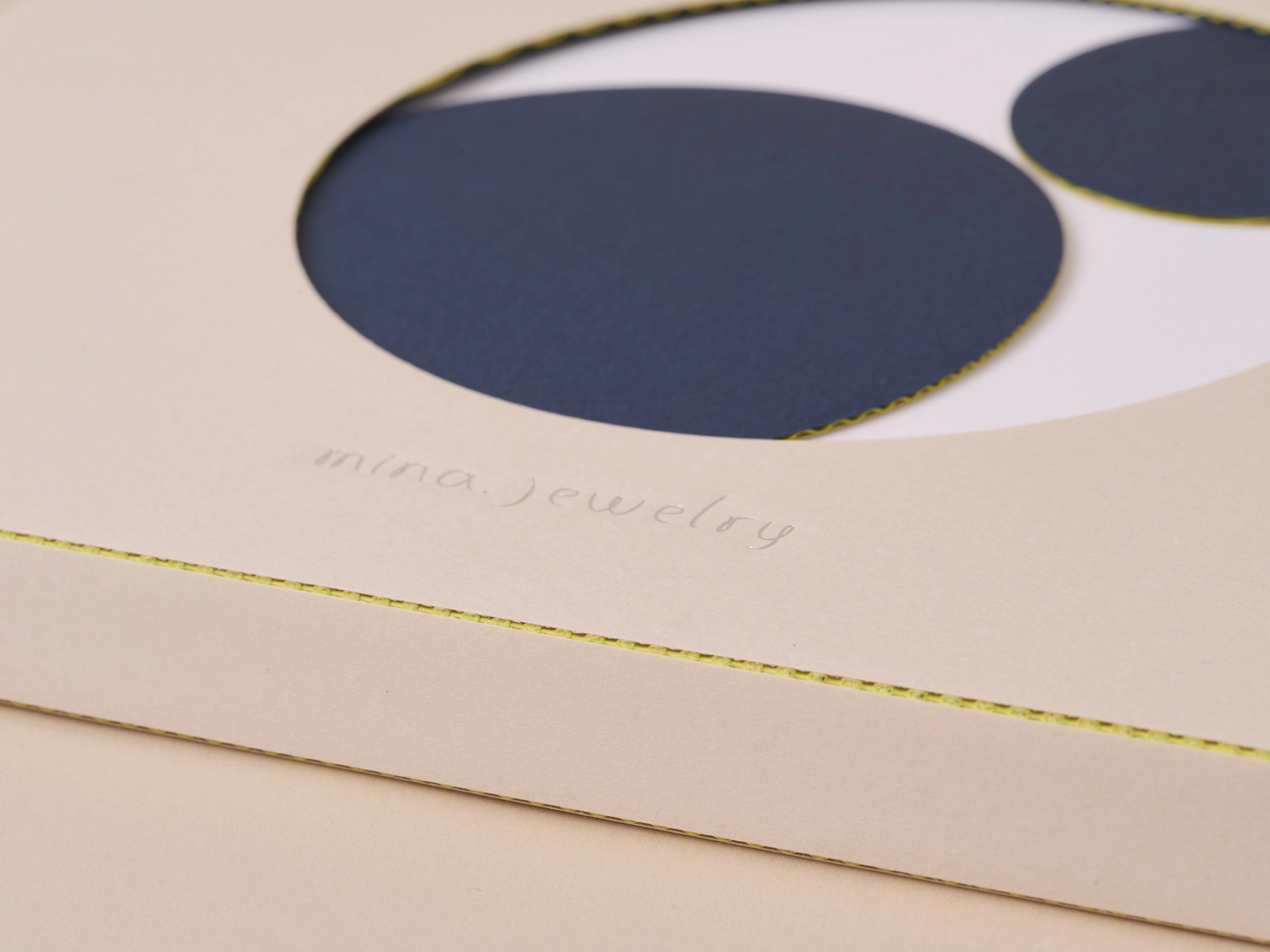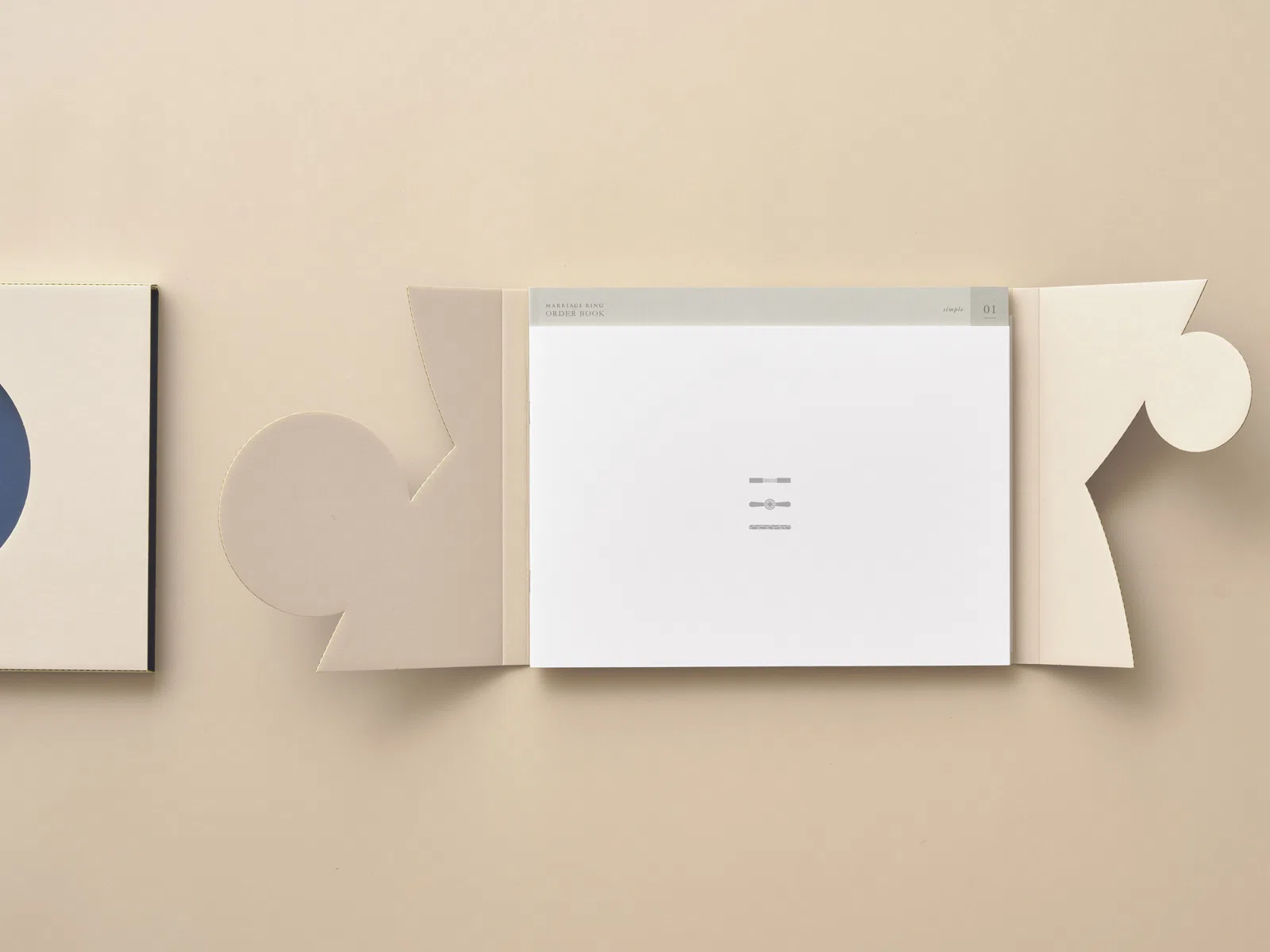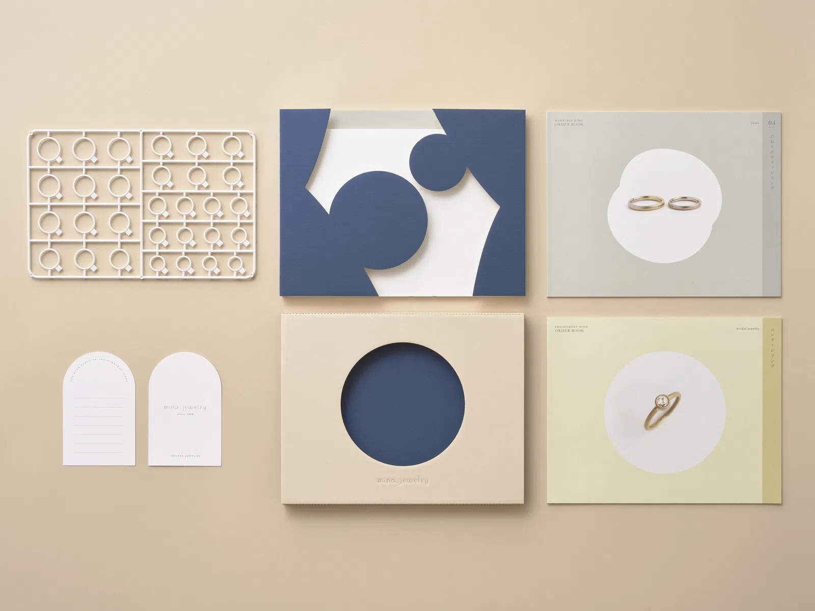 mina.jewelry(ミナジュエリー )さんは、セミオーダーで結婚指輪の製作をされているブランドです。今回AMBERでは、遠方の方やお店に直接伺うことができない方に向けたメールオーダー用注文セットのデザインを担当しました。結婚指輪を注文される未来のご夫婦に向けて、資料が届いたときの期待感、開ける喜び、この瞬間を忘れることのないような印象的なパッケージを目指しました。