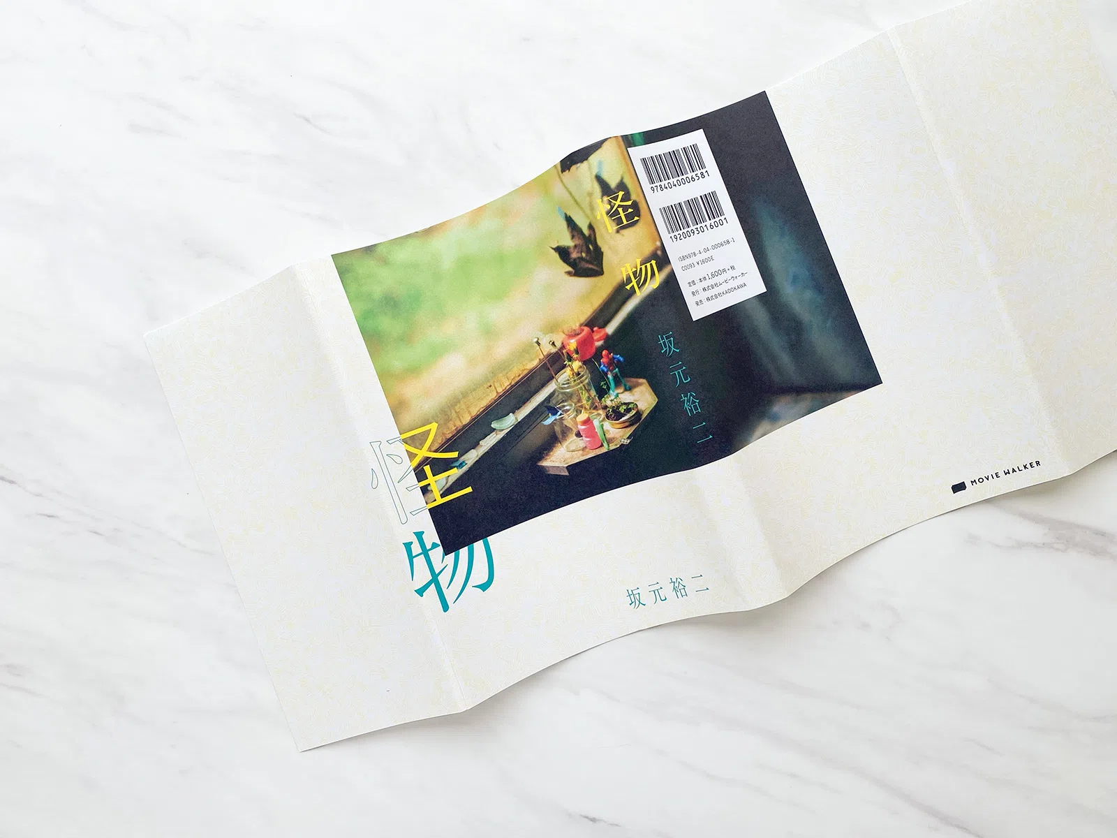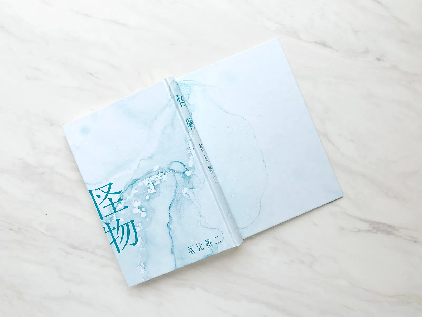 カバーには、本作の象徴的な美しくも荒廃したワンシーンの風景カットに、3つの表情が異なる題字タイトルのデザイン。表紙には、一見綺麗で不穏なマーブリング模様を配しました。用紙は、本作でも描かれる画用紙のような触感豊かな風合いと優れた印刷適性を持つ「アラベール-FS スノーホワイト」。加えて、周りの白に反射する見返しとして若いタンポポの様なエンボス質感の「タント F-60」を使用しました。本文ノド奥には“怪物”のテキストも潜ませ、それぞれの違和感の作用を忍ばせつつ総じて光が差し込むような装幀を意識しています。(石井勇一さん)