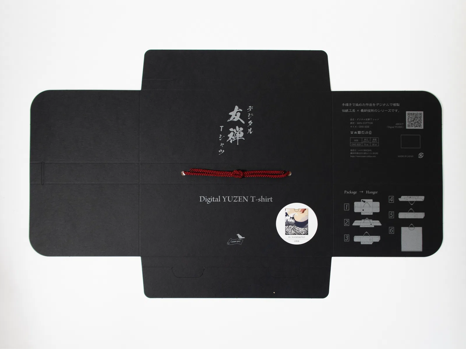 友禅職人による精緻な筆致を堪能できるプロダクトのパッケージとして、「気品がありプロダクトを引き立てること」を意識しました。また、着物のゼロウェイストな設計を取り入れたTシャツでもありましたので、パッケージにも「捨てないで使う」という役割を持たせています。「衣紋掛けになるパッケージ」です。そのため商品輸送・衣紋掛けと強度も欠かせません。そして、飾って鑑賞するという美的体験の面もあり、どの柄にも馴染む質感かどうかが最も重視した点です。