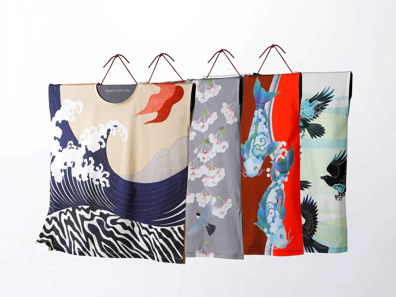 「デジタル友禅Tシャツ」は、高価な伝統工芸品である手描友禅をもっと気軽に愉しむことができるように企画したsome-pri(そめプリ)のプロダクトです。「手描友禅×デジタル」のシリーズで、友禅職人が着物と同じ工程を簡略せずに描いた原画を、デジタル捺染によって複製しています。