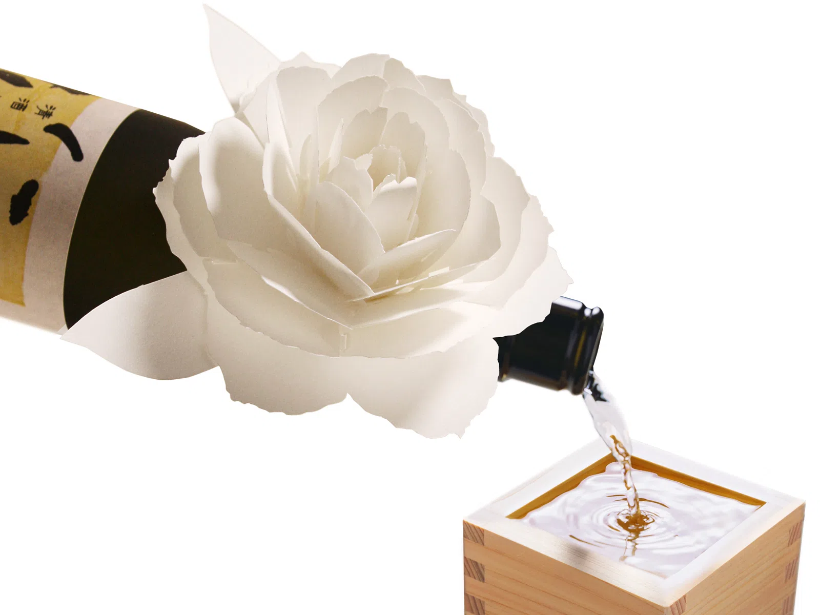 愛媛県、道後の老舗造り酒屋水口酒造株式会社がプロデュースするCAFE BAR&ショールーミングストア道後一会にご縁をいただき、商品化した「紙の花の瓶飾り」です。お祝い事やハレの日には欠かせない日本酒。瓶に咲く白い紙のバラが、特別な日を演出します。瓶飾りは閉じた状態からポップアップカードのように開き、瓶に付けることができます。44個の紙のパーツを手作業で組み合わせてバラの花を表現するため、しなやかな強度のあるアラベール-FSを選びました。(三好祐一さん)