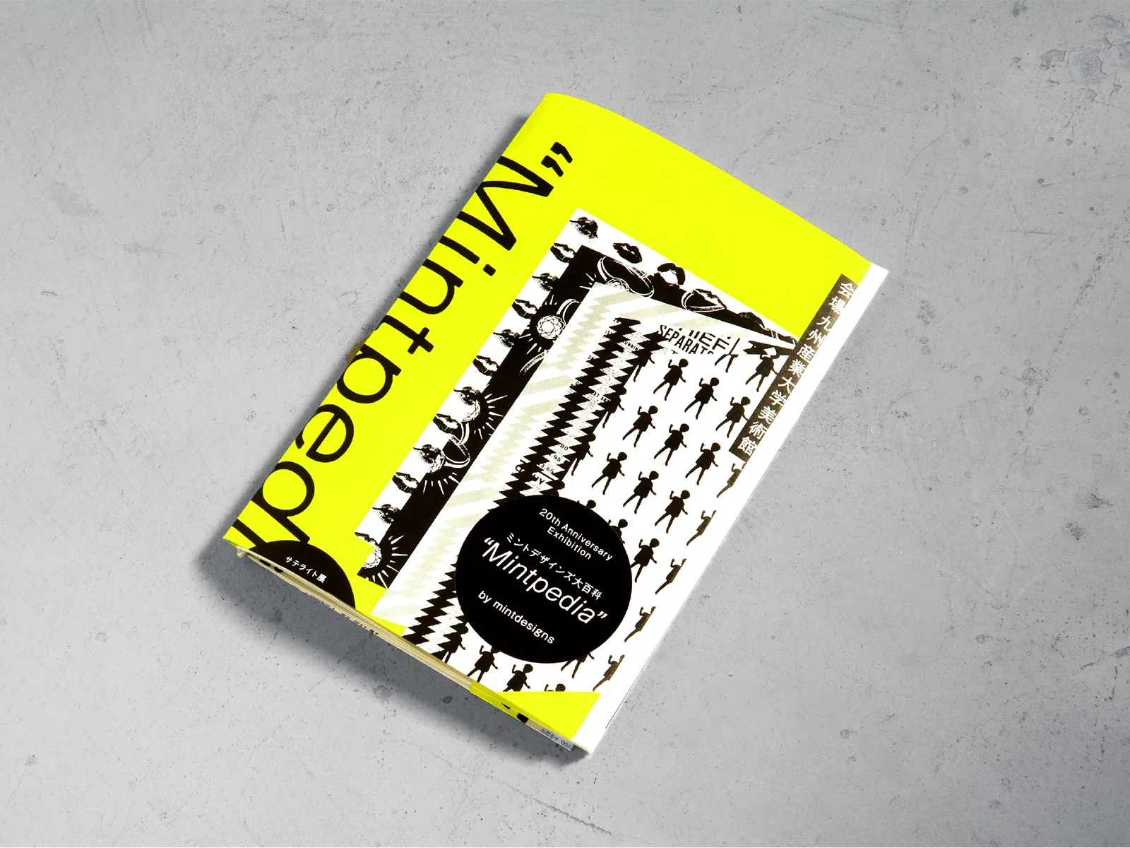 ファッションブランド「mintdesigns」の20周年展に合わせ発行された、デザイナー勝井北斗さんと八木奈央さんのインタビューやクリエイティブをまとめた冊子。2人の多様なデザインワークを表すために、光沢の強い「ルミナホワイト」、マットな「MTA+-FS」、ざらっとした「タブロ-FS」など様々な紙の質感を一つの本に取り入れました。スクラップブックのようなイメージで、表紙やポスターなどをゴムで束ねて冊子を構成しています。表紙は九州産業大学美術館で開催した巡回展のフライヤーそのものを折りたたみ、タイトルのシールを貼って仕上げました。(村上雅士さん)