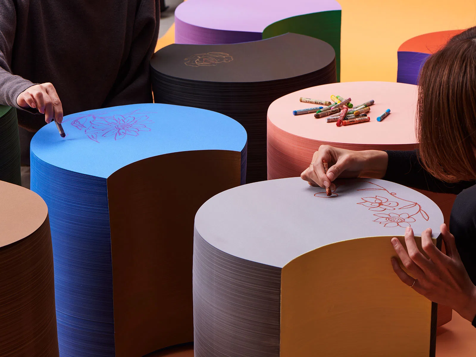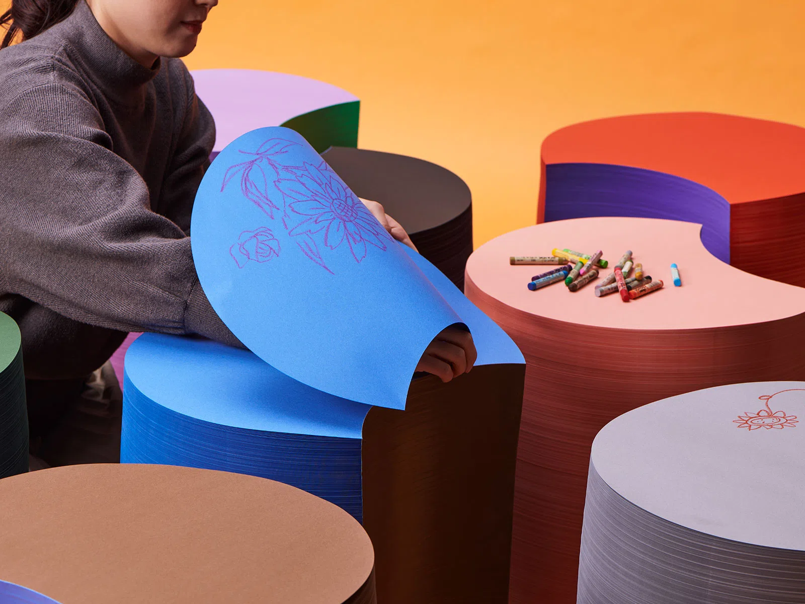 「PAPELITH(ペパリス)」は、敢えて用途を明示しない紙の積層でできたプロダクトです(椅子にもテーブルにもインテリアにも、おもちゃにもなる)。「NTラシャ」の紙色の力強さと手に触れたときのしなやかさに惹かれ、さまざまな空間に置けるよう3つずつ並べた際のテーマカラー(ポップ、シック、ナチュラル)に合う色をセレクトしています。(吉永久美子さん)