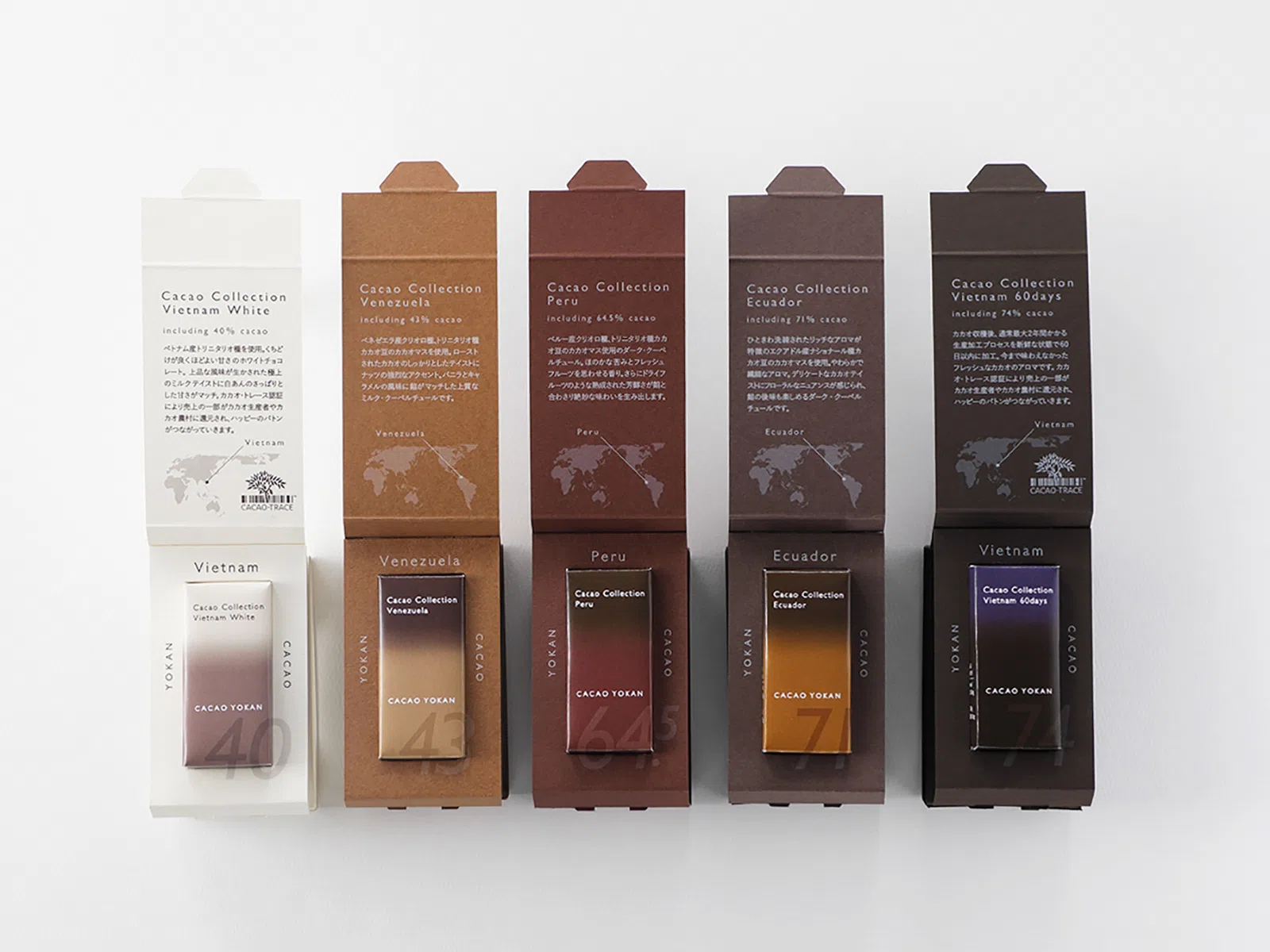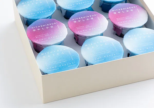 素材にこだわり、職人が丁寧にお菓子を作り続ける老舗和菓子店、塩瀬総本家の新規開発商品「カカオ羊羹」。この商品で使用されるカカオは、生産者に売上の一部を還元するサステナブル・プログラム「カカオ・トレース」のもの。カカオの配合率が異なる5 種の羊羹を、深みのある色合いで、茶系の色バリエーションが豊富な「ビオトープGA-FS」で表現しました。「ビオトープGA-FS」は、ラフになりすぎない素材感とシックにまとまる上質感が特徴。素材にこだわって丁寧に作り上げたこのカカオ羊羹に、上質なパッケージの世界観を演出することができました。(Studio APさん)
