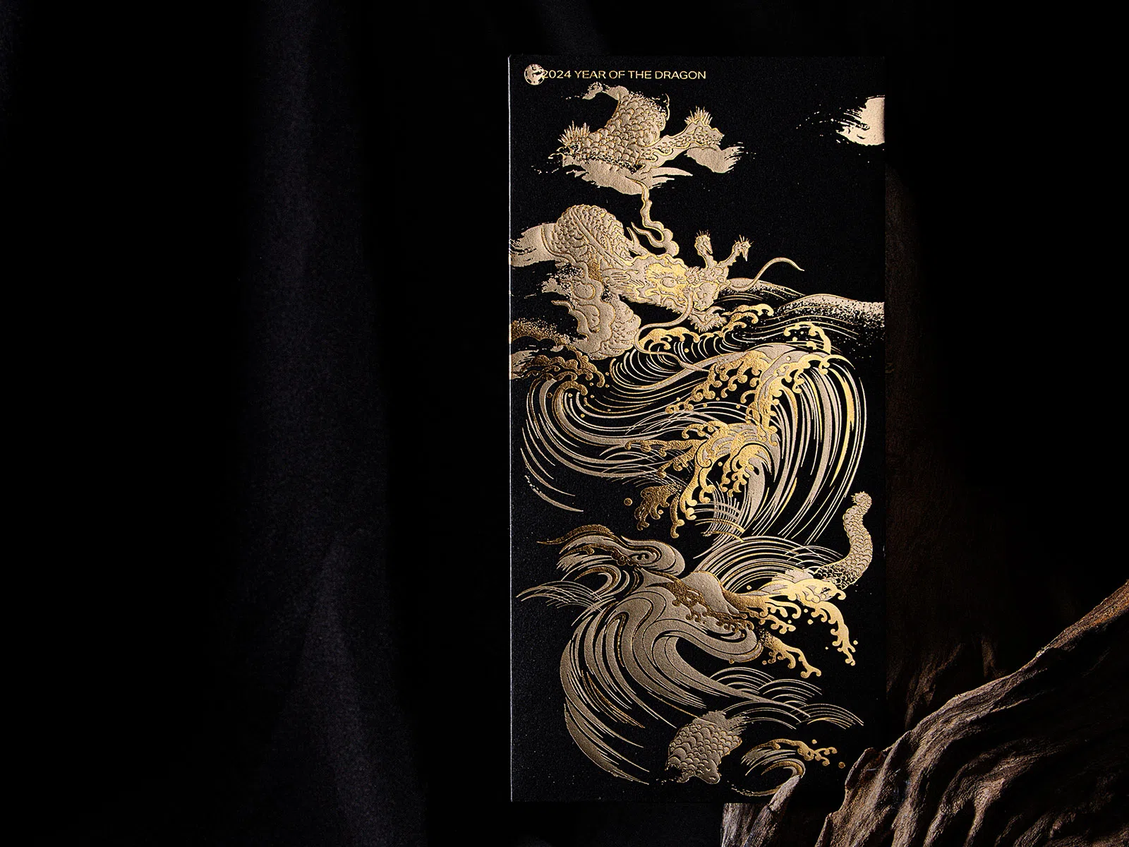 龍與浪、壽石、松柏,雖從未存在真龍現身,但自古以來對龍的敬畏想像從未停止,所以我們詮釋三種龍的意象,分別為海浪的呼風喚雨海龍,壽石山形的龍脈,松柏樹軀幹的意象龍,從人對於自然物的投射去表現龍的形意,結合到現代燙金工藝,以及新年文化的紅包載體。