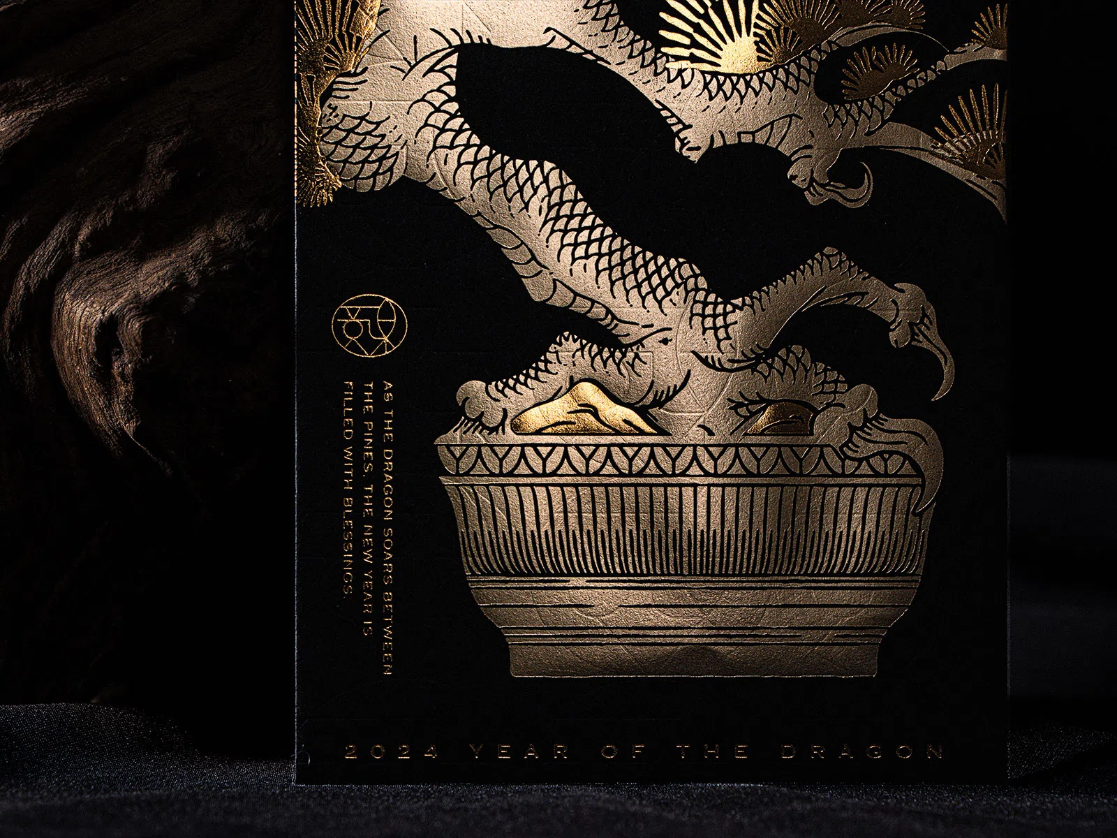 龍は実在しませんが、古来より人々から龍への畏敬の念は絶えることなく、その姿を自然へと投影してきました。風を呼び雨を降らせる海龍、山々を流れる龍脈を表す寿石、龍のような造形の松の幹という3種の龍のイメージを選び、現代の箔押しの技術、「紅包袋」を送る新年の習慣と融合させました。