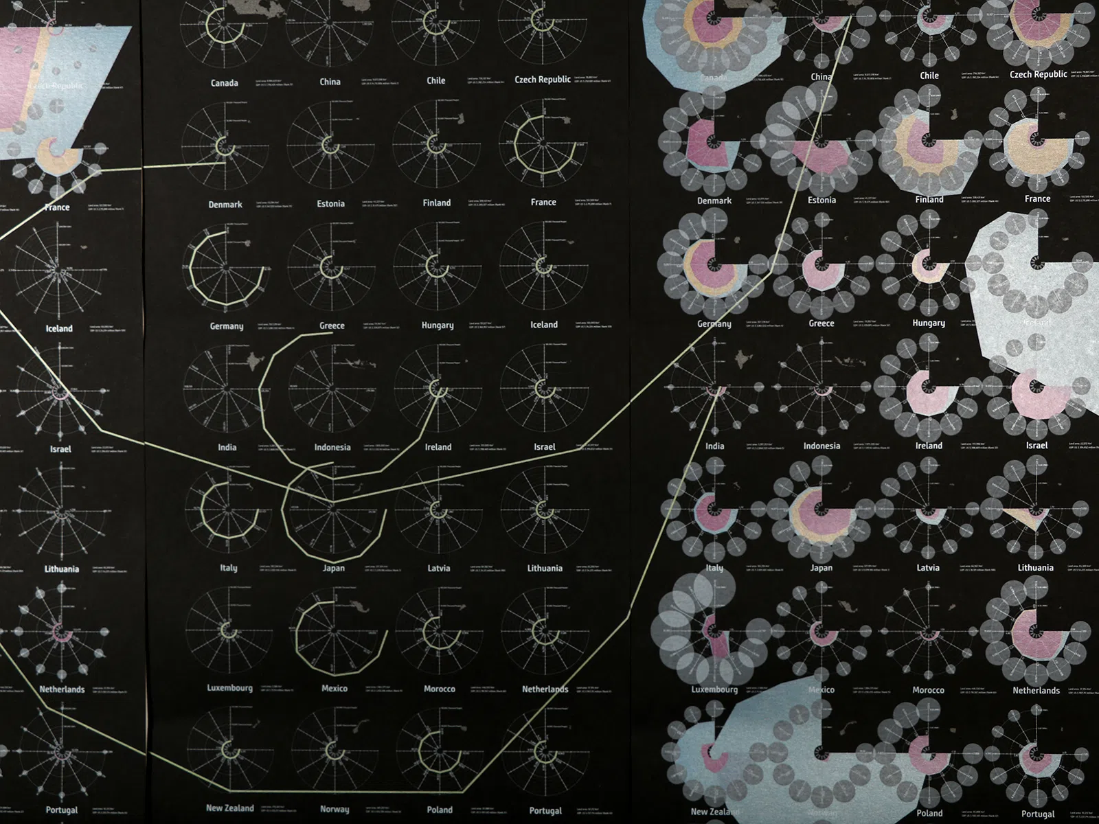 IEA (International Energy Agency) に情報を公開している国に限定し、1975年から2020年までの化石燃料、原子力、再生可能エネルギー、それぞれの発電量と、CO₂の排出量を5年ごとに集計し、一望できるよう視覚化しました(1枚目左)。加えて、各国の人口の推移(1枚目中央)から一人当たりの電力消費量、CO₂排出量のグラフを作成し(1枚目右)、環境問題を国単位ではなく、個人単位で見ることで、新しい発見があればとダイアグラムポスターを制作しました。