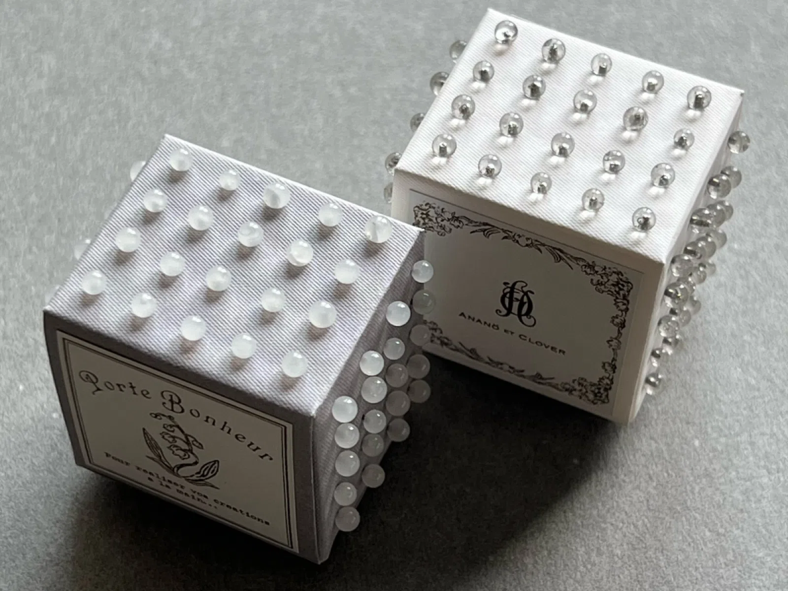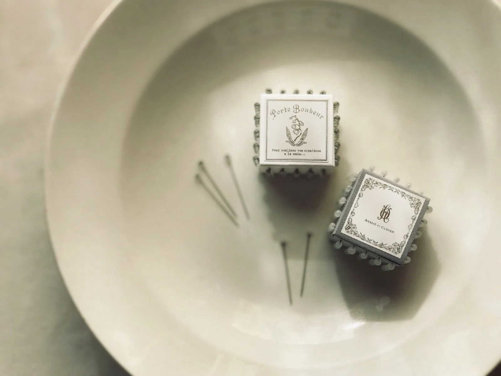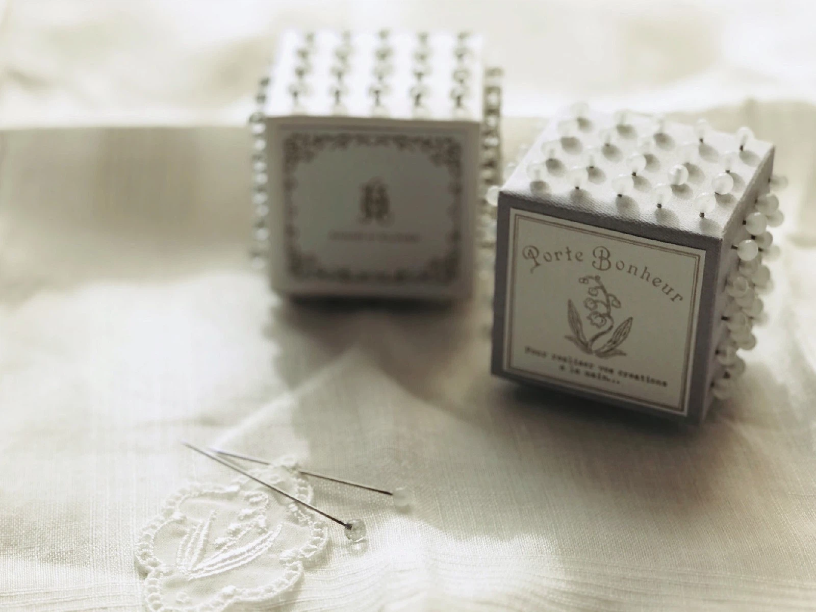 パリの蚤の市やアンティークショップで見かけるようなちいさなキューブに刺さったたくさんの待針。アイテムに宿る物語を想像させるような待針を作りたくて「Porte Bonheur」のコンセプトに合う、雰囲気のある紙をずっと探していました。