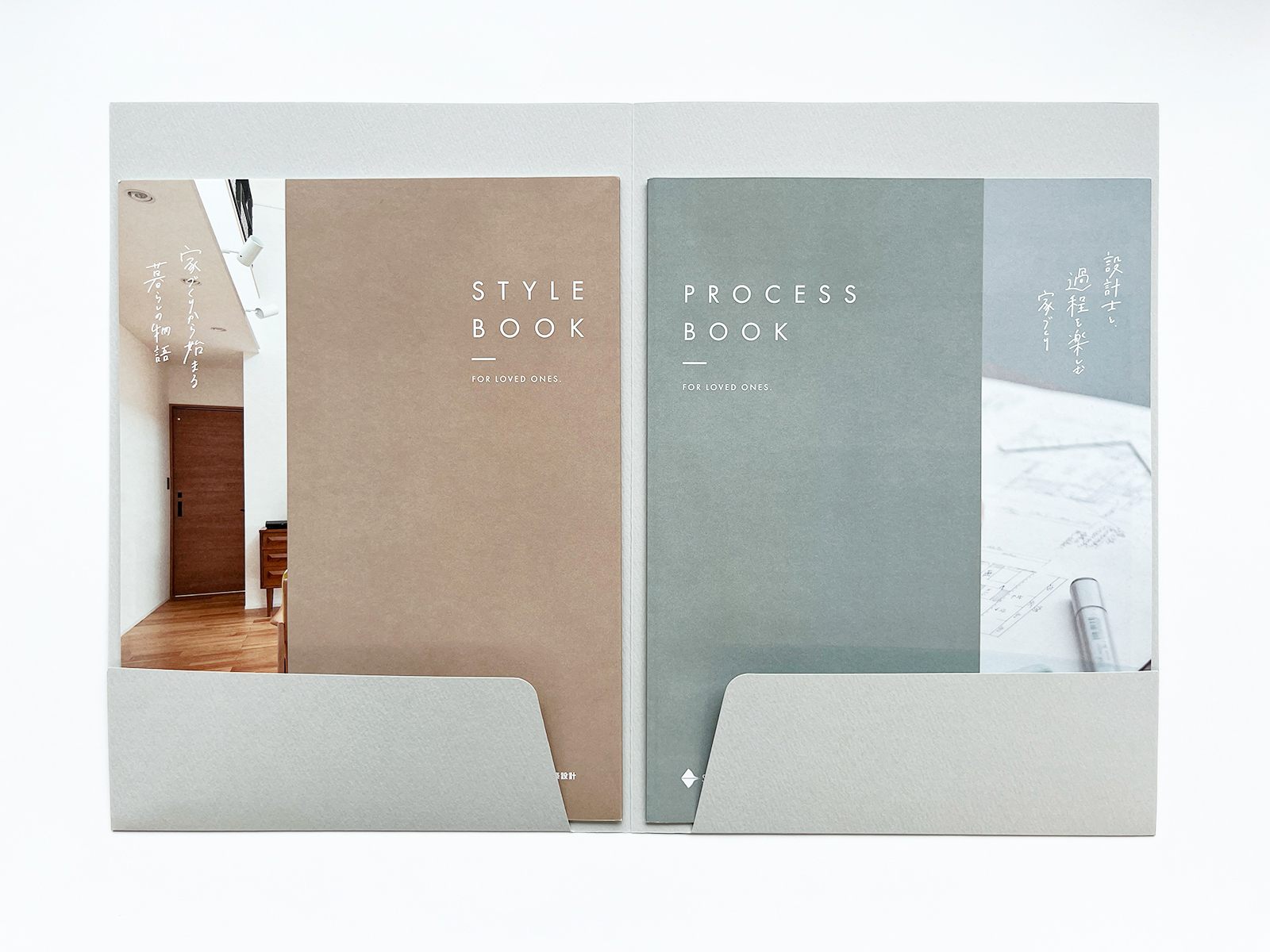 滋賀県高島市を拠点とする株式会社澤村様の住宅部門、SAWAMURA建築設計の施工事例冊子「PROCESS BOOK / STYLE BOOK」2冊を収納するポケットフォルダーを制作させていただきました。