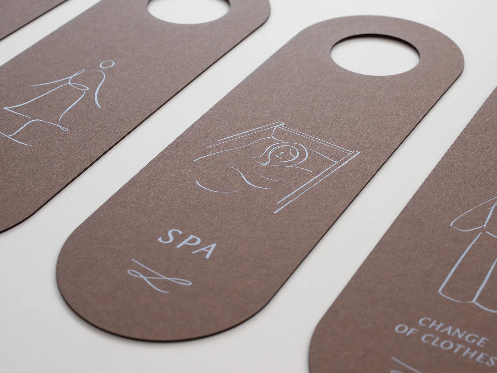 Mökki(モッキ)は酵素温浴のサロンです。酵素温浴は電気やガスなど一切使用せず、自然の発酵で生じる熱を利用して身体を芯から温めます。そこから着想し、ナチュラルなイメージに合うように、優しいテクスチャや品の良さがある「GAファイル」を選びました。強度と厚みがあることも大きな選定のポイントです。また、ドアサインは量産の必要がないことからUVインクジェットで印刷しています。(岡本和華さん)