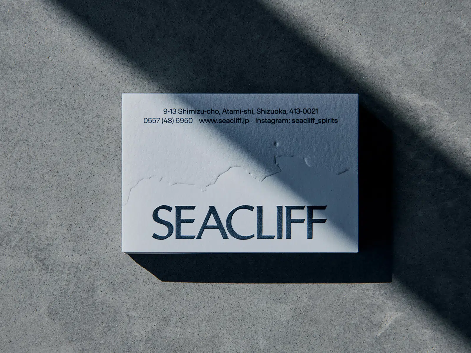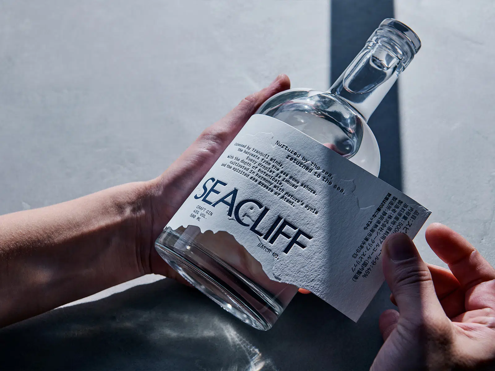 熱海の地に生まれた、海をテーマにしたクラフトジンのパッケージ。クリフ(崖)とMade in Japanを表現するために「わたがみ」をセレクト。崖を演出するためにラベルの広範囲に空押し加工を施した結果、「わたがみ」本来の風合いがプレスされることにより、スムースな表面が生まれた。(永田洋平さん)