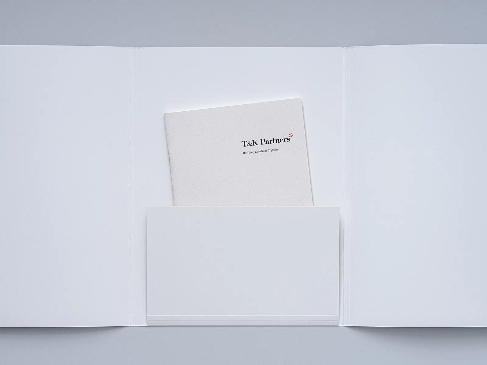 法律に関する専門的な内容を読みやすくするために、電車の中でも気軽に読めるA5サイズの業務案内を作りました。紙は柔らかい風合いの「アラベール-FS」を使い、簡単には捨てられない静かな存在感を持たせました。しっかりとした「OK ACカード」のタトウには業務案内だけでなく、様々な書類を入れられるように、筋押しを数カ所に入れて厚みを持たせられる仕様にしました。(森治樹さん)