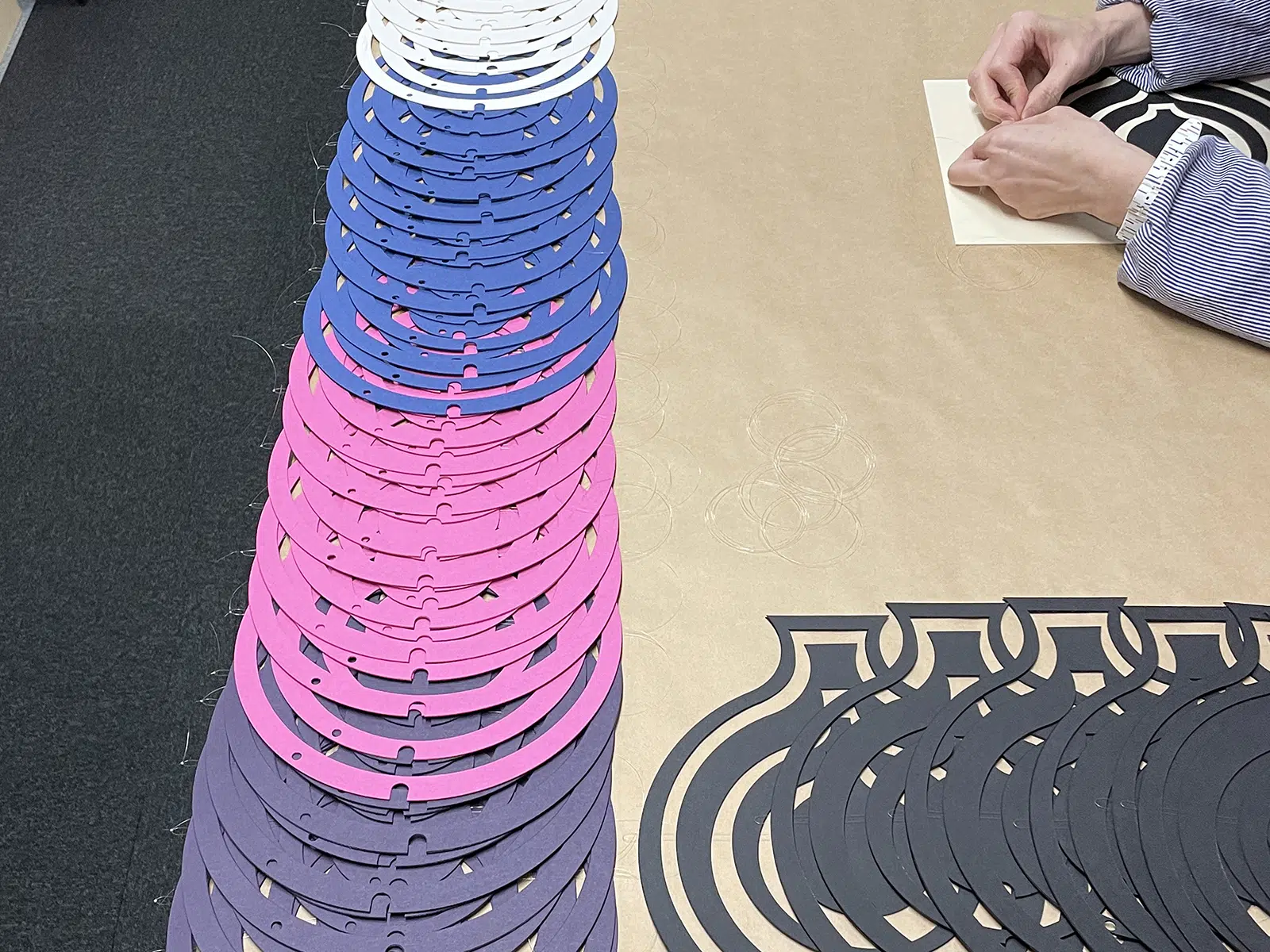 今回色数を増やすにあたり、初版時のポイントが厚さと発色であったことから「カラープラン-FS」を選びました。「カラープラン-FS」はレーザーカットの切り口が美しく、素材感と発色もよく、なにより色数が豊富にあることが再制作に新しさを持たせたいというイメージにぴたりと合いました。モビールの形への組み立て作業は社内で行なっています。「カラープラン-FS」の色の力もあって、楽しい気持ちで進みました。河野鷹思の作品に近い3色を加え、6色のバリエーション展開で販売しております。(吉川 縁さん)