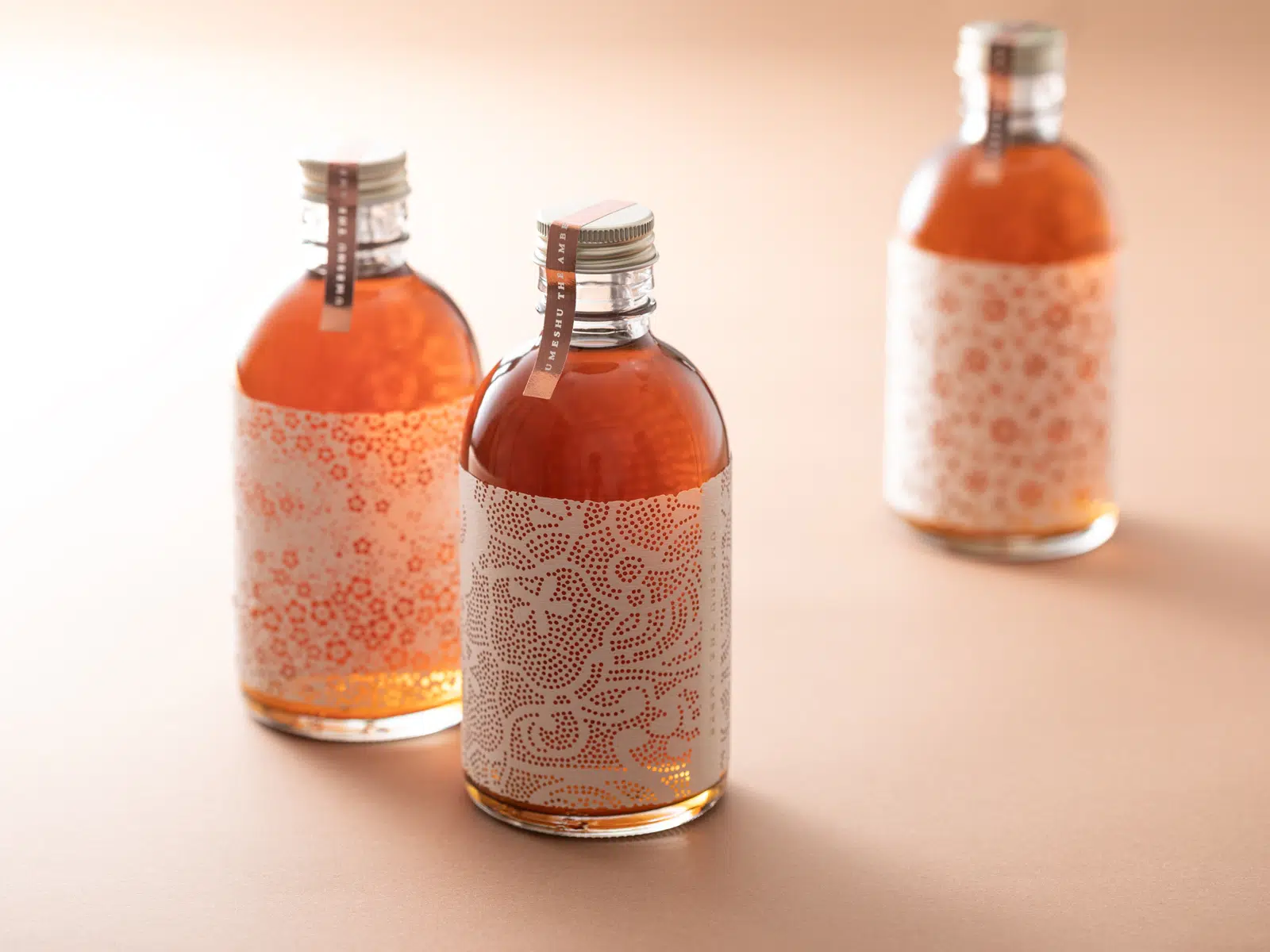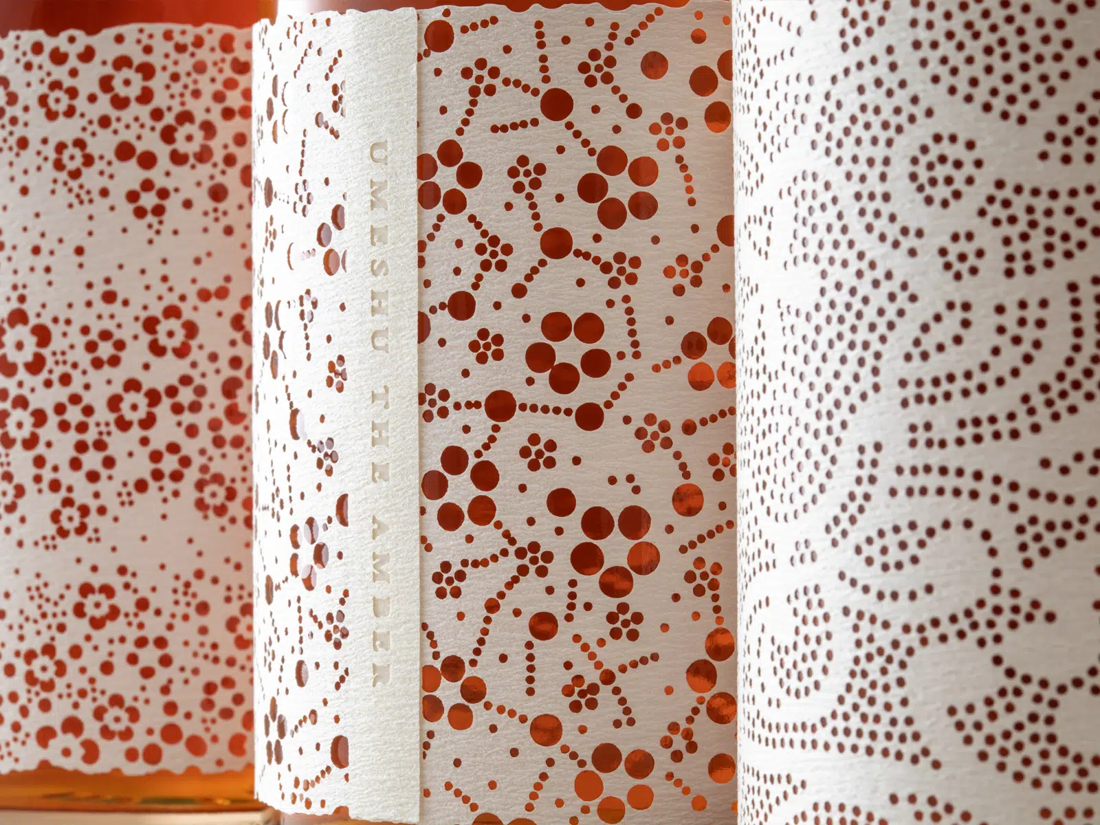 “UMESHU THE AMBER”は、厳選された紀州の梅を使用した長期熟成ヴィンテージ梅酒です。ボトルを包む白いラベルは、紀州文化の一つである和服の染め型紙の梅文様をモチーフにしたデザインで、「新だん紙」をレーザーカットで抜いています。