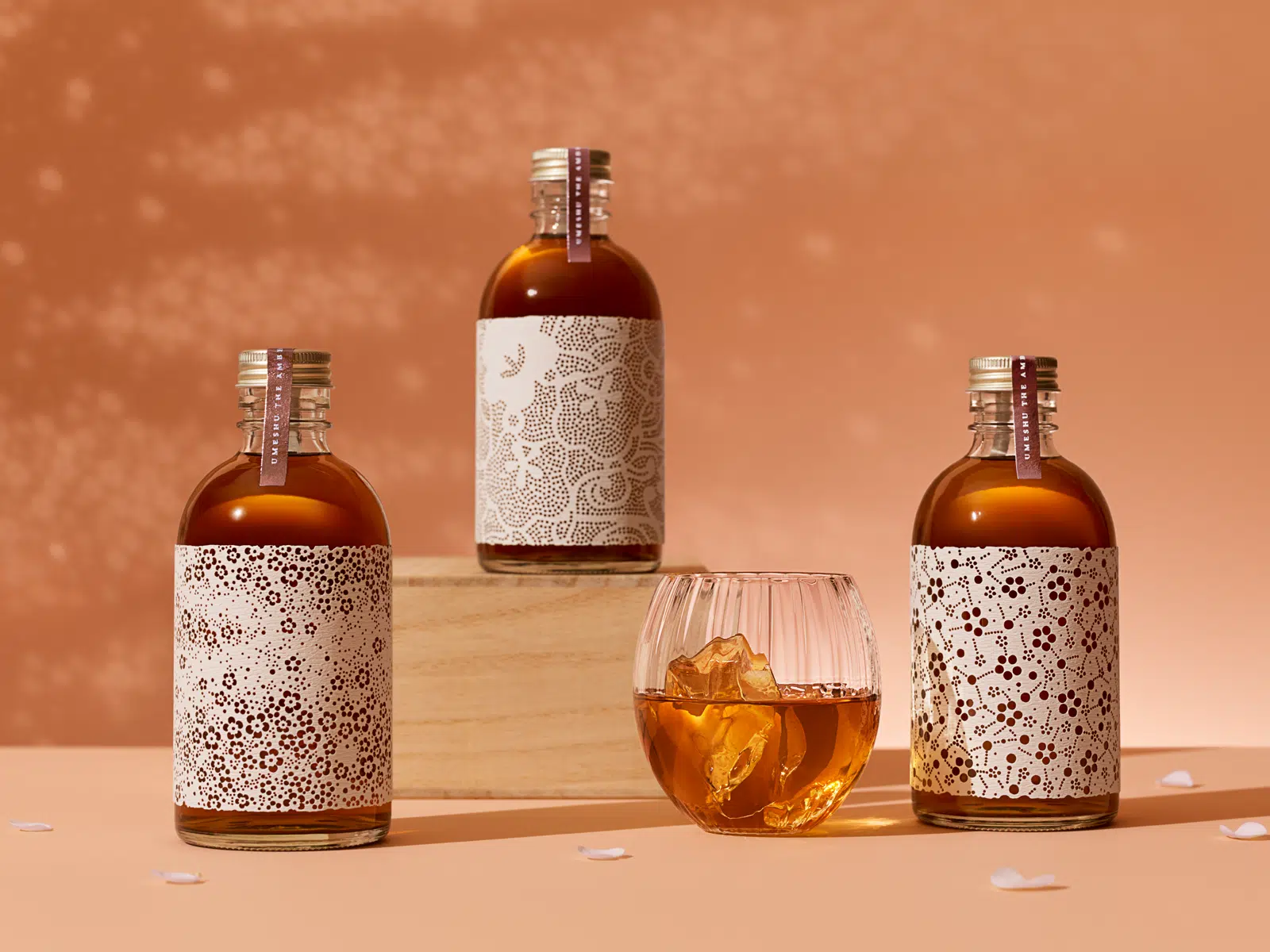 いろいろな紙で試作しましたが、伊勢型紙の緻密な抜きを施してなお日本らしさのあるテクスチャを出せたのが「新だん紙」でした。白いラベルの繊細な窓から、琥珀色の液体を目でも味わうことができる特別なデザインを目指しました。(天野和俊さん、白井絢奈さん)