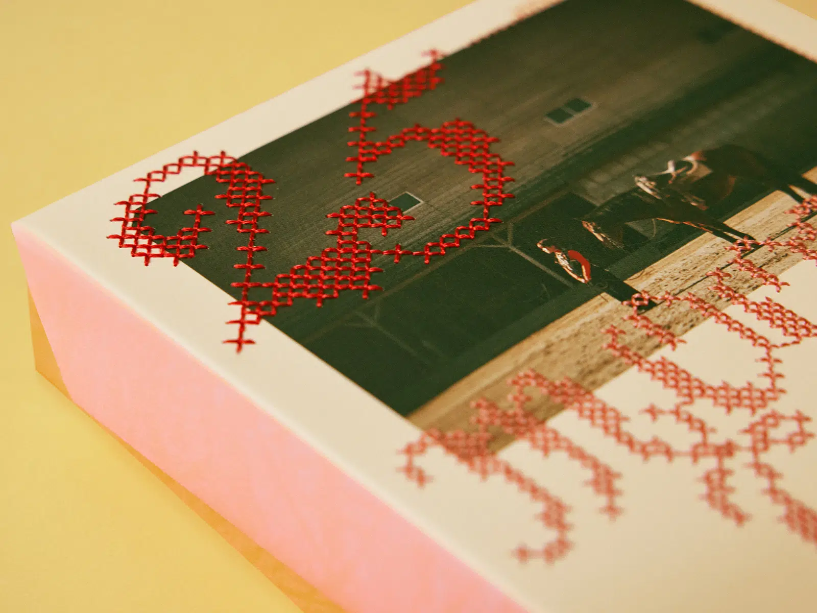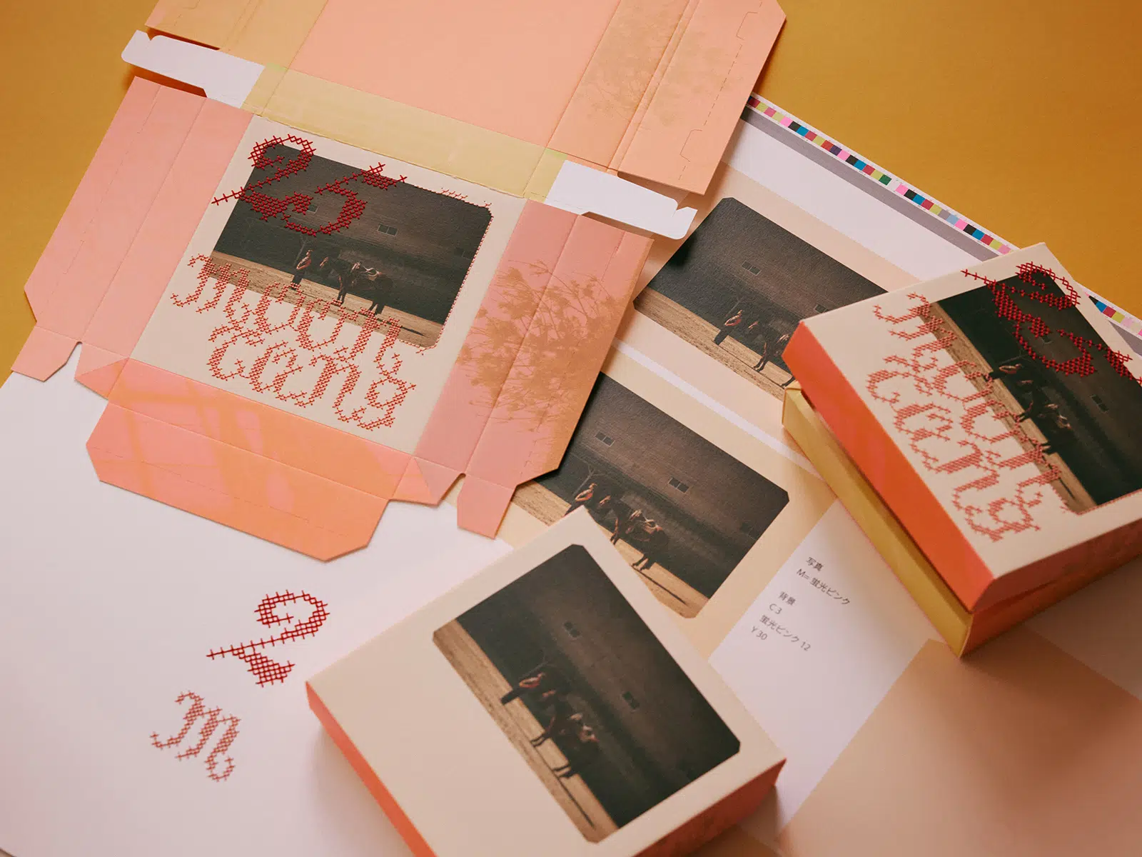 オフセット5色印刷(4色+特色蛍光ピンク)、刺繍加工、抜き、ヒンジ箱(リボン付き)