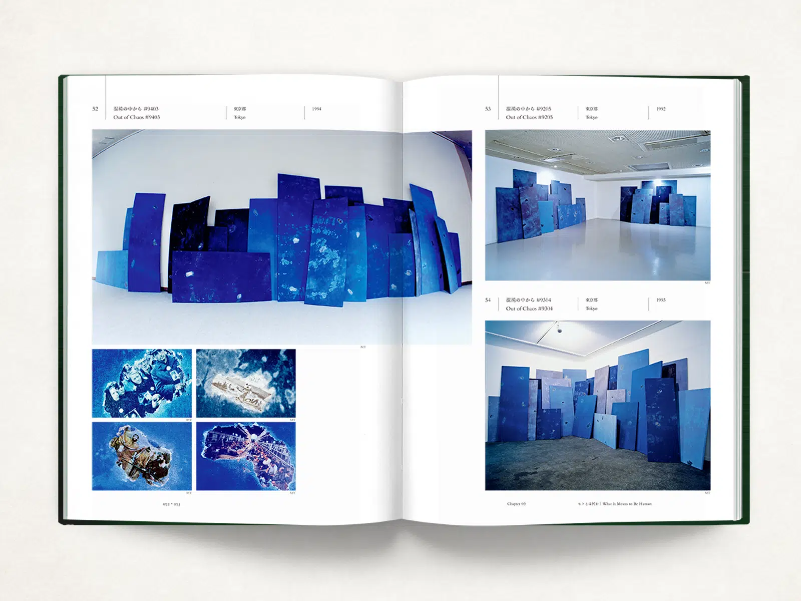 アーティスト 丸山芳子さんの40年以上にわたる活動の作品集・活動記録集です。インスタレーション、絵画、交流プロジェクトなど、ジャンルにとらわれず活躍されているため、表紙デザインは特定の作品などを使わずにタイトルのみのシンプルなものにしました。このようなデザインの場合は、紙の力が重要になります。今回は、作品のイメージに近く印象深い色をもつ「グムンドカラーマット-FS No.91」を選択しました。表紙の色味と相性のよい見返しの「ビオトープGA-FS ネイビーブルー」は銀インキの発色も抜群です。背にあるクータ部分の「NTラシャ」は僅かしか見えないながらも存在感のある色を選びました。(橋詰冬樹さん)