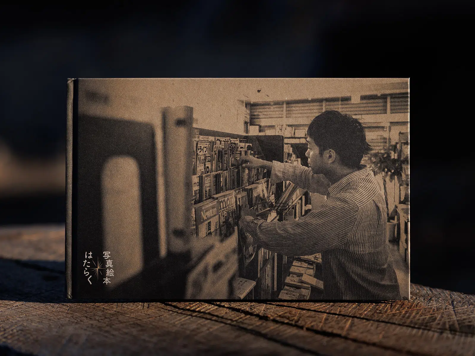 さまざまな職業のひとの一日に朝から晩まで密着してつくった写真絵本シリーズの第一弾。写真からにじみあふれる生活感、体温のある人間の営みを生かすためにも、手に取ったときにラフな手触りがあるものにしたいと思い、「サガンGA-FS プラチナホワイト」を選びました。写真はモノトーンながら、白の顔料箔ともあいまって、版画的な立体感のあるカバーになったとおもいます。