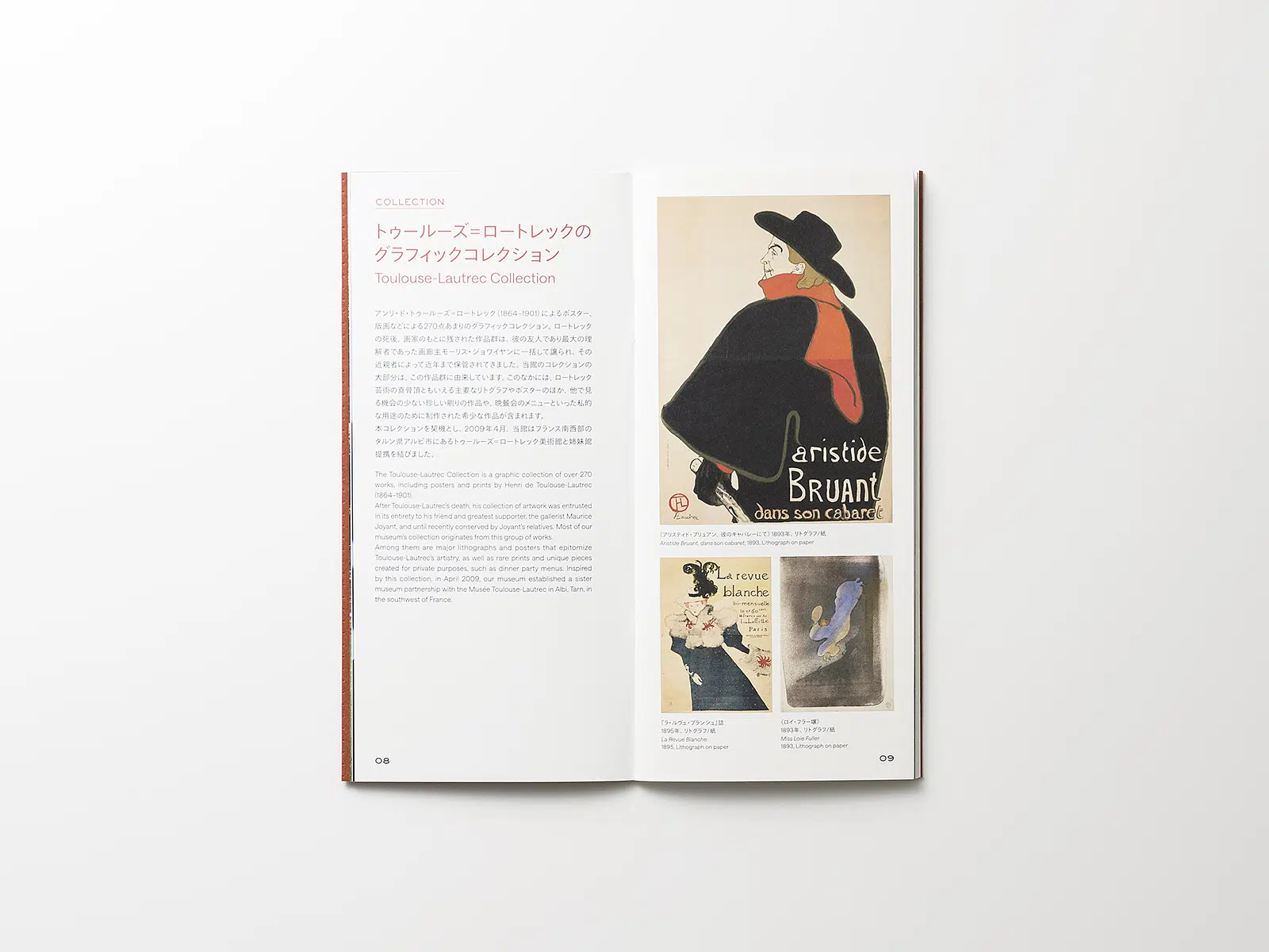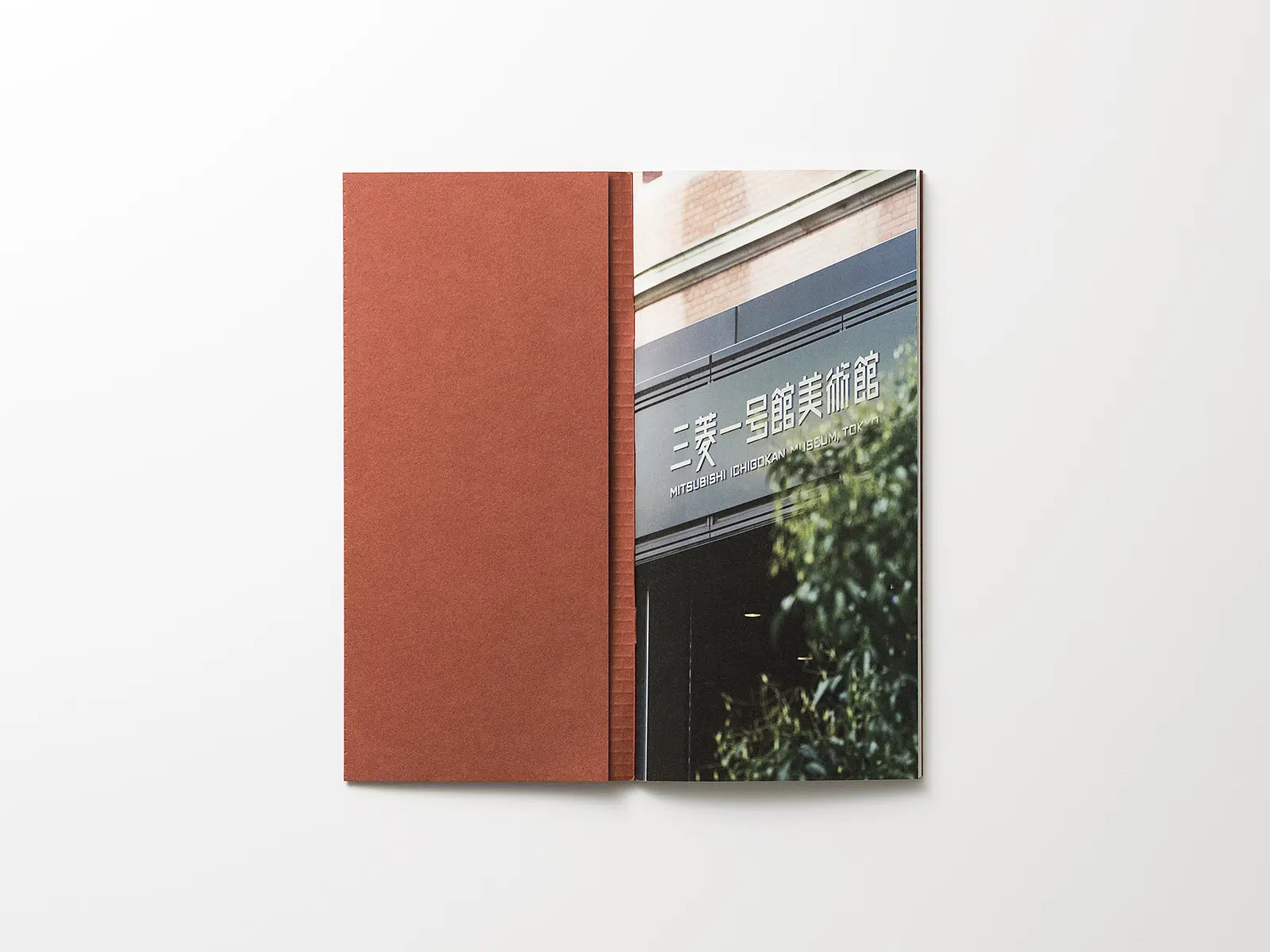 三菱一号館美術館の概要を紹介するパンフレット。美術館の象徴である赤レンガを想起させる冊子にしたいと思い、色味や質感から「ビオトープGA-FS アンバーレッド」を表紙に使用しました。本文は白すぎず、かつ印刷適性も高い「テイクGA-FS」を使用。表1にレンガのパターンを空押しすることでレンガらしさを強調し、冊子自体の大きさも実際に使われているレンガの胴面と合わせました。また表3にはスリットを入れ、毎年更新される展覧会ラインナップの紙を差し替えることで、無駄なく使っていただけるようにしています。(芝野健太さん)