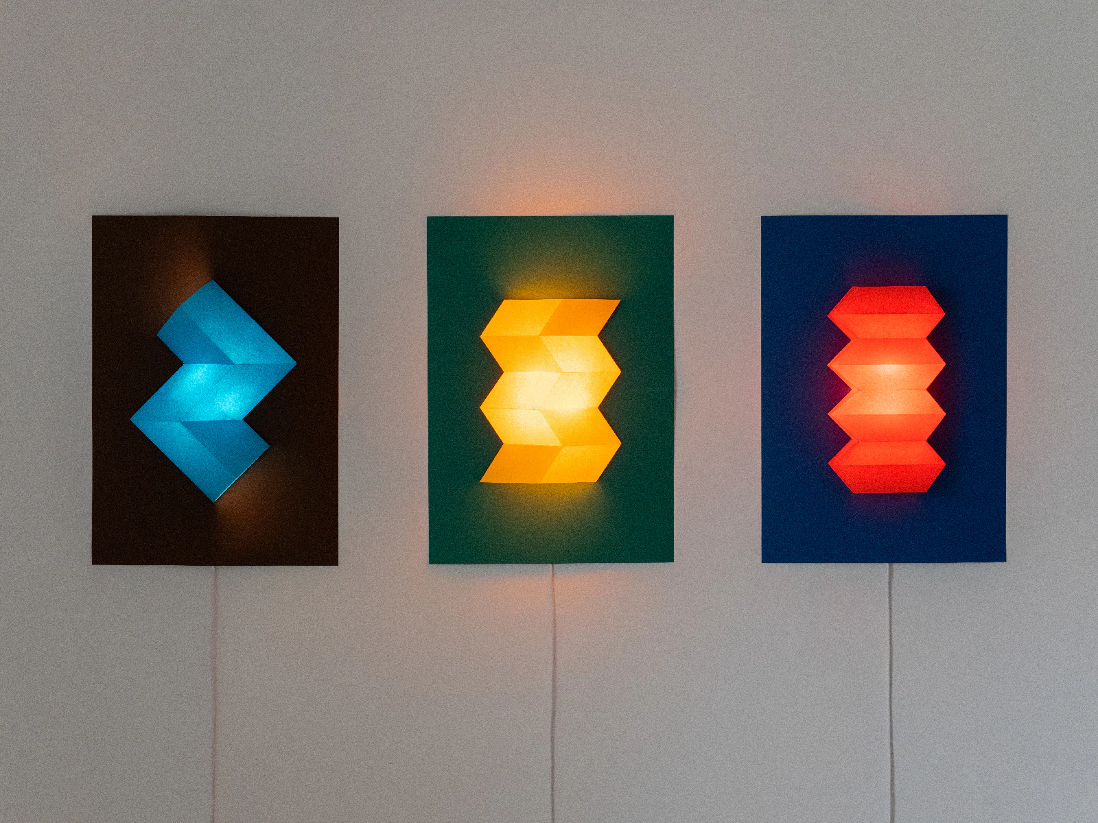 紙だからできる、山折りと谷折りでできた幾何学立体のライトです。昼は立体の生み出す陰影、夜は鮮やかな紙の形と色を生み出します。形と色の力で、部屋が楽しくなる照明を作りたいと考えました。鮮やかで、プロダクトとして成り立つ強度があり、折った際にエッジを綺麗に表現できるため、今回の紙を使用しました。シェードに使用している「マーメイド」は、ライトを点けた時に、紙が優しく透過するため、紙の色を活かした照明を作ることができました。光っている時も、光っていない時も、部屋を楽しく照らします。(本山真帆さん)