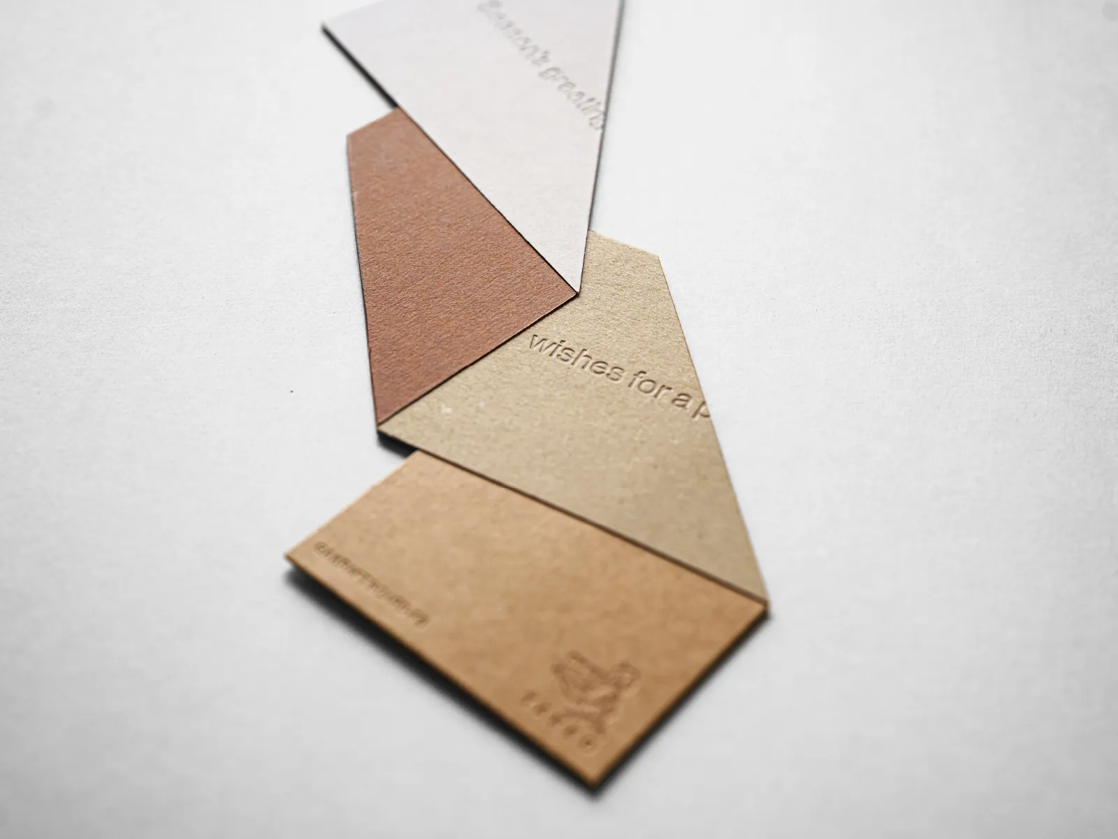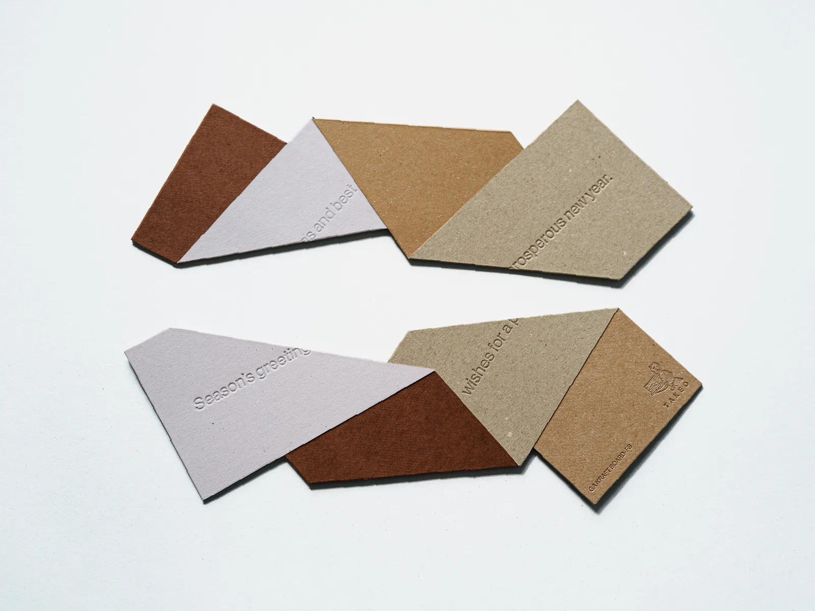 そこで、貼合の枚数を調整して各パーツに異なる厚みを持たせ、手作業で組み上げることで、一枚の厚紙をひねり折ったようなメッセージカードに仕立てました。素材の魅力を形態そのものから感じ取れる仕上がりを目指しています。(大原健一郎さん)