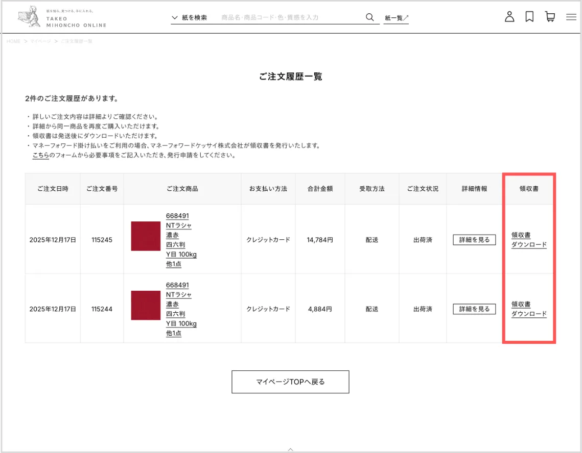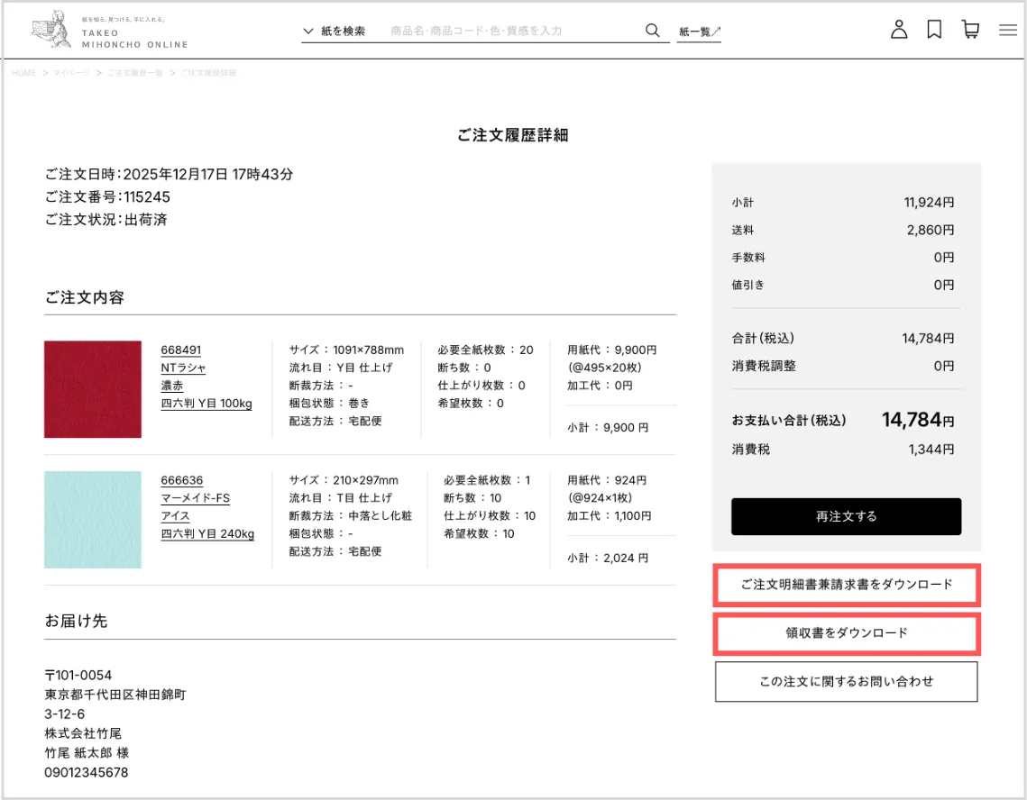 詳細画面ではご注文の対応状況をご確認いただけるほか、インボイス対応の注文明細書や領収書のダウンロードが可能です。また、「再注文する」ボタンを押していただくことで、同じご注文内容をカートに入れることができます。