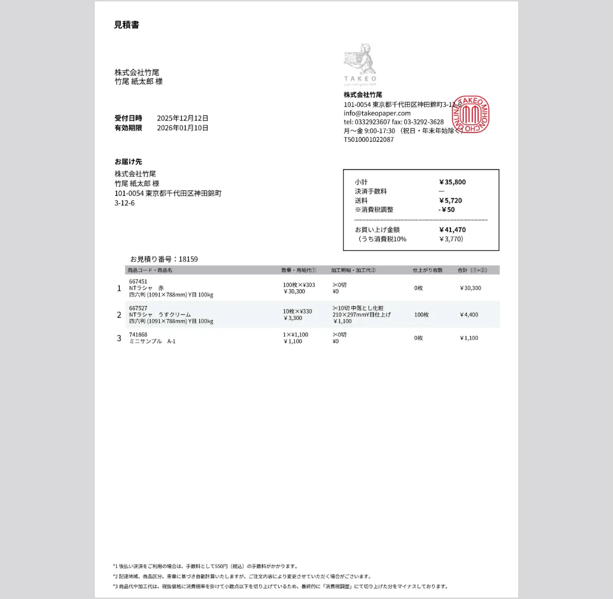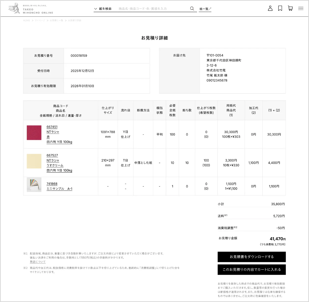 - 有効期限内であっても、お見積りの内容(商品数量、断裁方法、お届け先など)の変更・削除はできません。改めてご希望の内容にてお見積りください。
