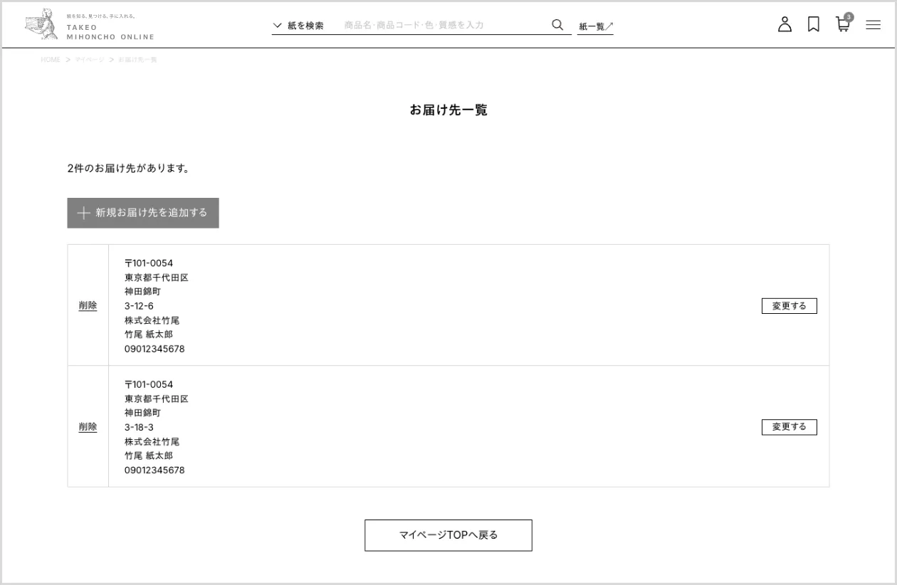 新規お届け先を登録できるほか、登録済のお届け先情報を修正することができます。