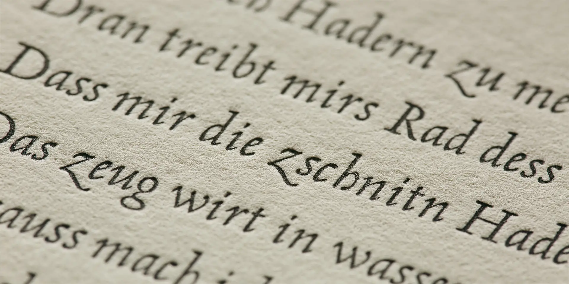 オフセット印刷と比較すると、墨がより黒々とすり上がり、紙に微かなへこみが生じるのが大きな特徴です。